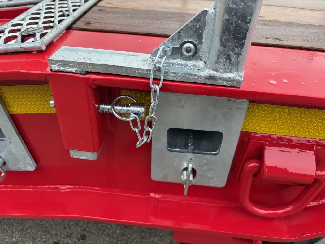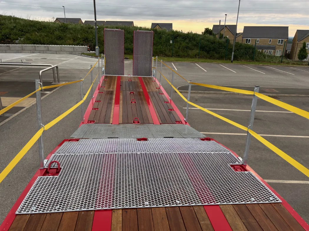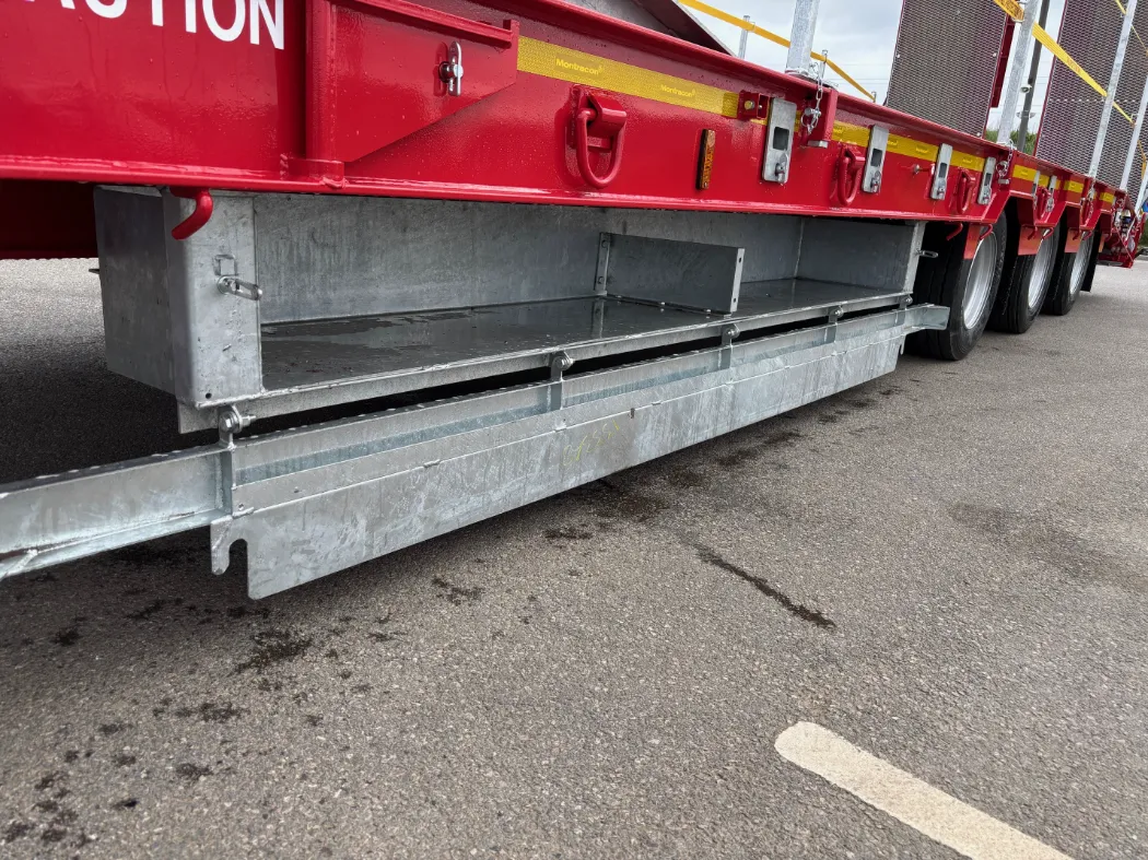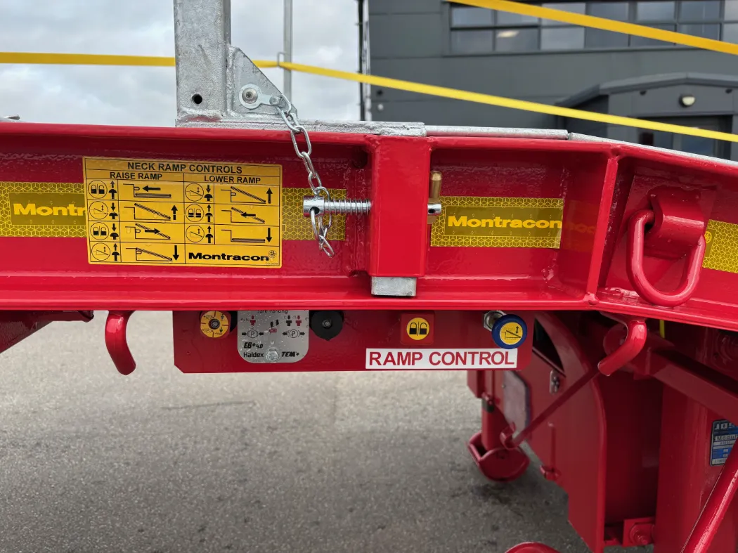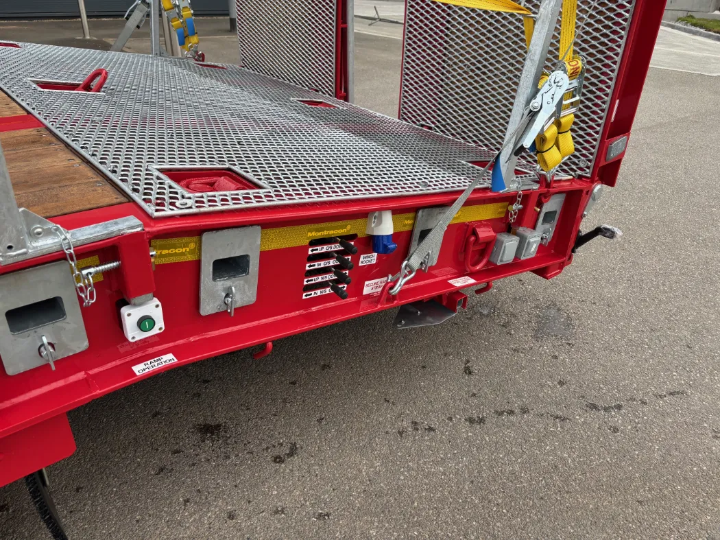 Montracon MT45 (2025) - Access spec - Low loader - Tri axle - Front lift axle - Hydraulic flip toe ramps - Sliding in and out ramps - Mesh on all sloped areas - Front chain wells - Eclectic winch with wireless remote - Additional lashing points in the floor - Air operated neck - BPW axles - Outriggers - Storage basket. IN STOCK IN A RANGE OF COLOURS.