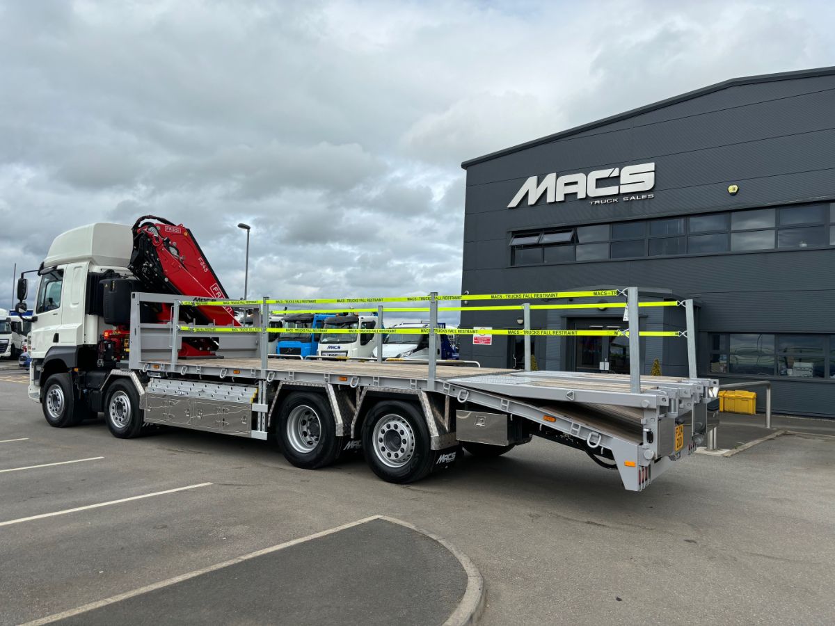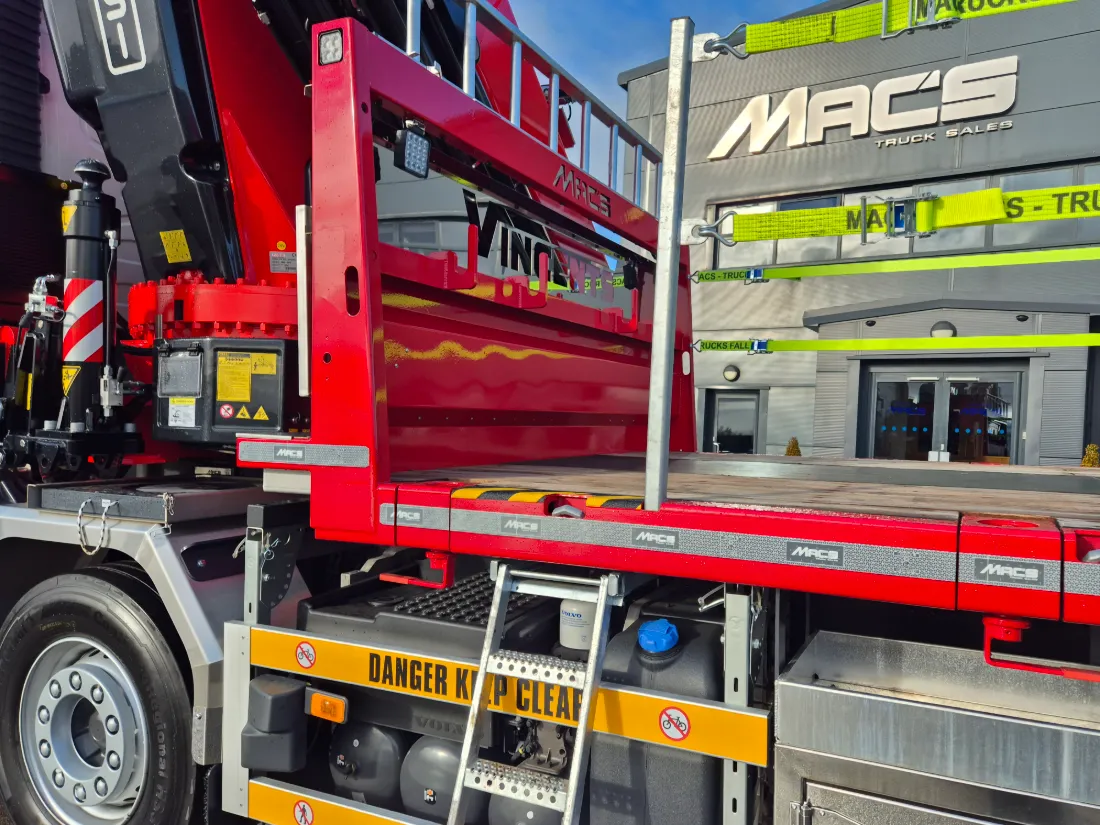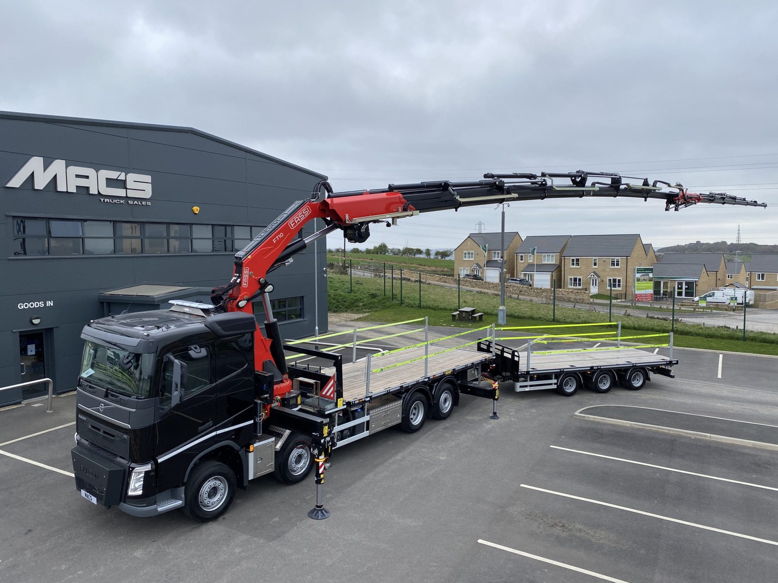 Here at Mac's, you do not have to choose from what we have built, you can have your own choice of chassis, crane, truck, colour and standard of finish. Bespoke is what we do. Whether it be a Volvo FM Globetrotter with a F710, fly jib and winch, front legs, flat body, drawbar spec, with alloys, Kelsa bars, air horns, side bars, specialist lighting and paintwork, to a straightforward DAF with a F710, flat with a red body. The choice is all yours. If we know what you are wanting to do, we can build the ideal truck to suit that need. Give us a call to discuss your needs.
