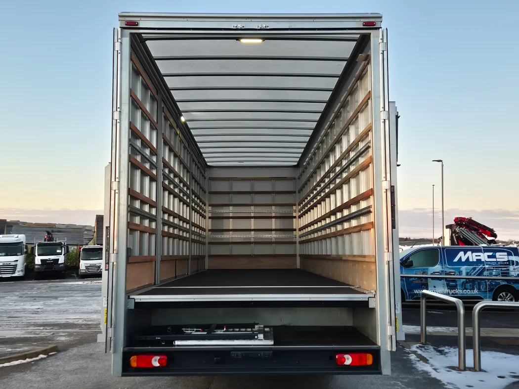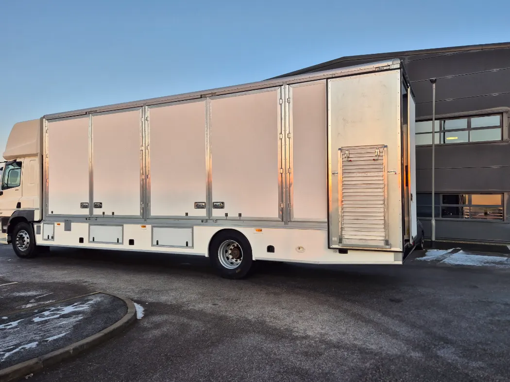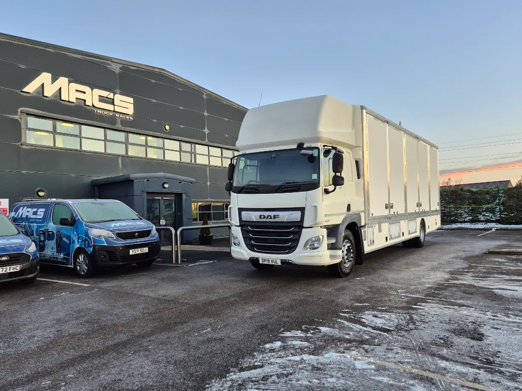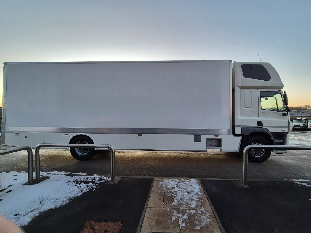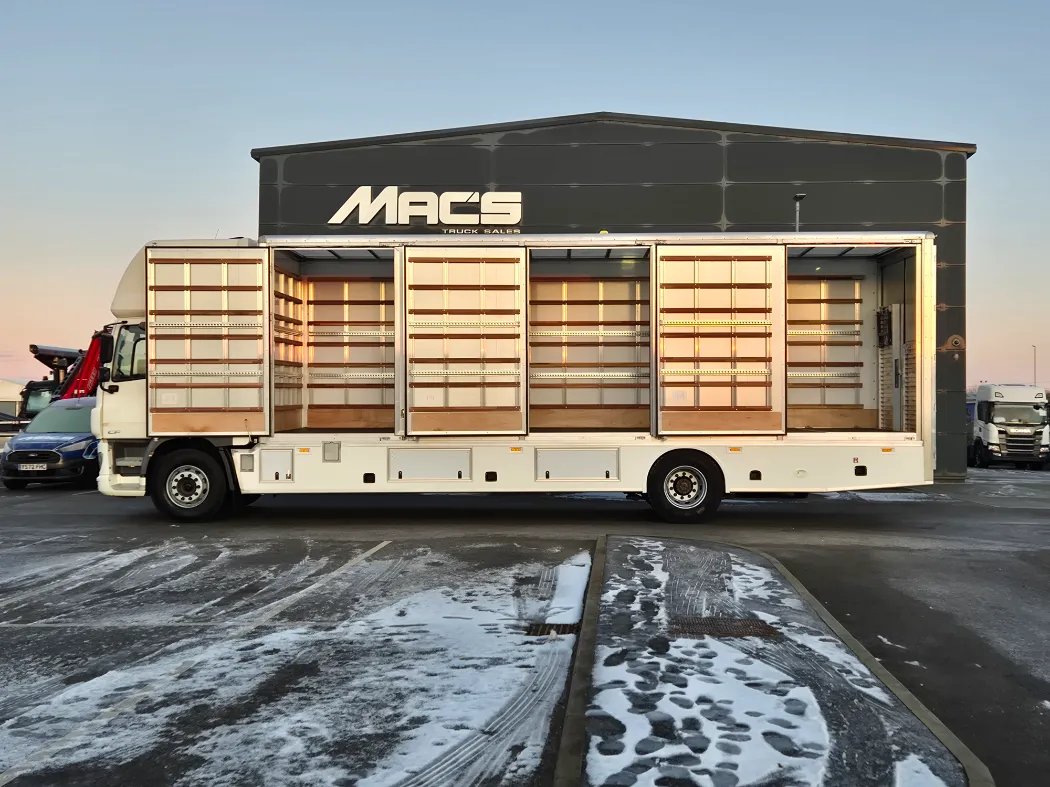 DAF CF 260 – 18T – Twin sleeper cab – Auto gearbox – Rear air suspension – 314,000km – Brand new 5 container mac’s body – Rear barn doors – Tie rails fully kitted inside – Under belly locker storage – External body lighting – 2 x rows of load lock -Aluminium tables and ramps – Side marker lights sunk into the body – Ready to paint your colours.