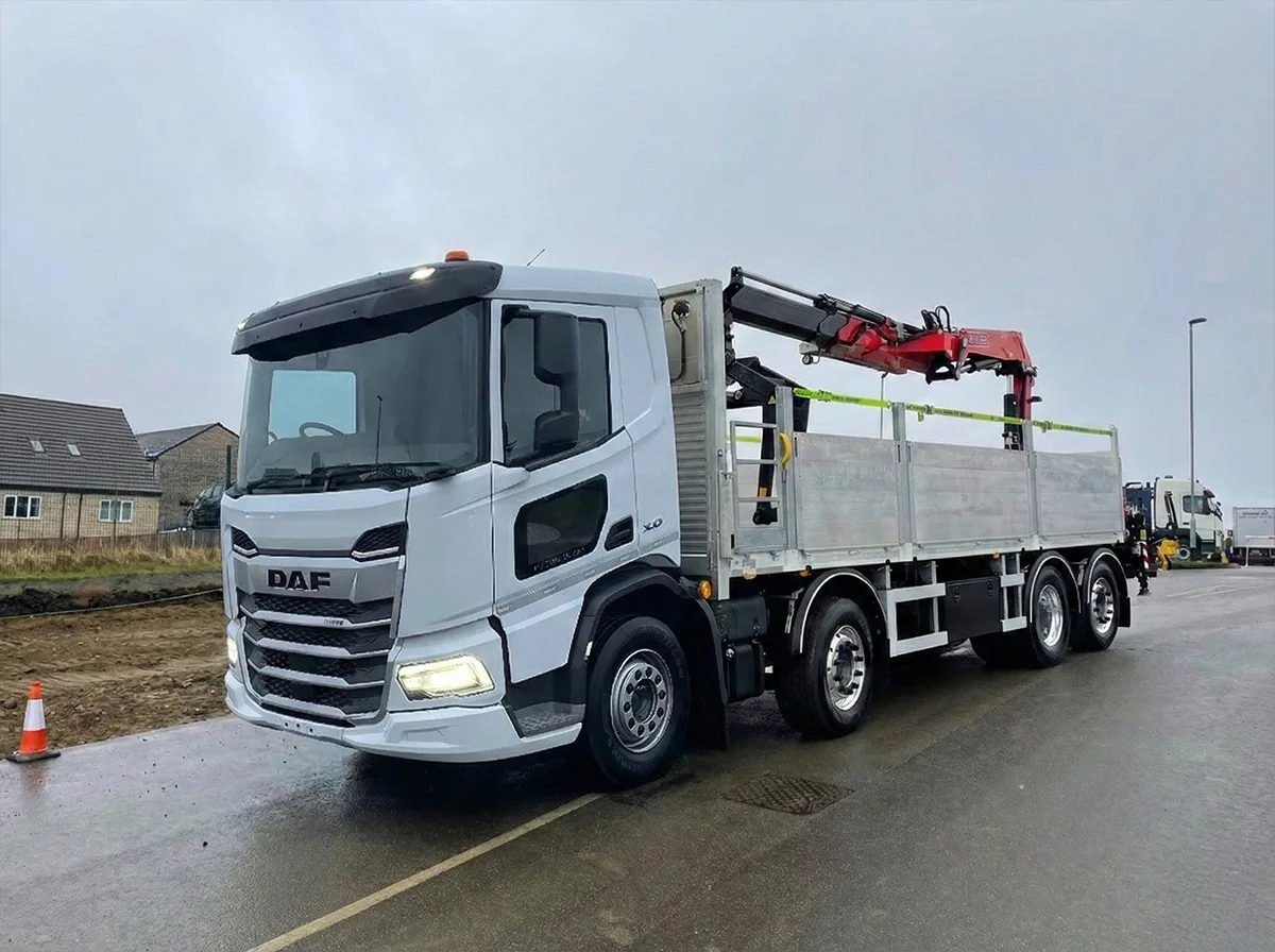 DAF XB450 day cab - 8x2 - Rear lift and steer - 9T front axles - Auto gearbox - Builders merchant spec body - Built to your measurements - Body access ladder - Lashing points in the bed -  Cab high headboard - Thermoplastic mud wings - Drawbar spec Fassi F155A.2.22 crane - 2 hydraulic extensions - Remote control - Kinshoffer sccissor brick grab Available for lease, rent or purchase.
