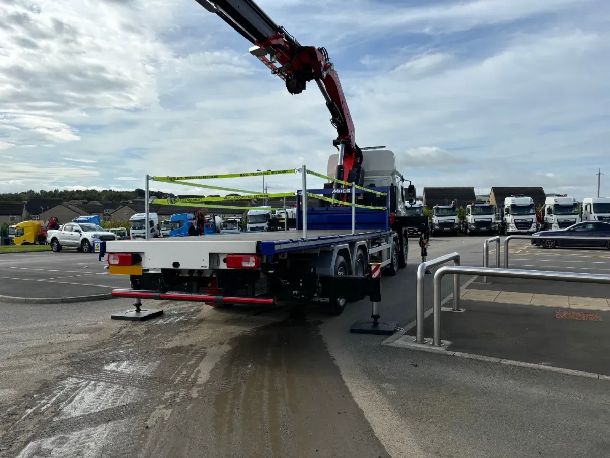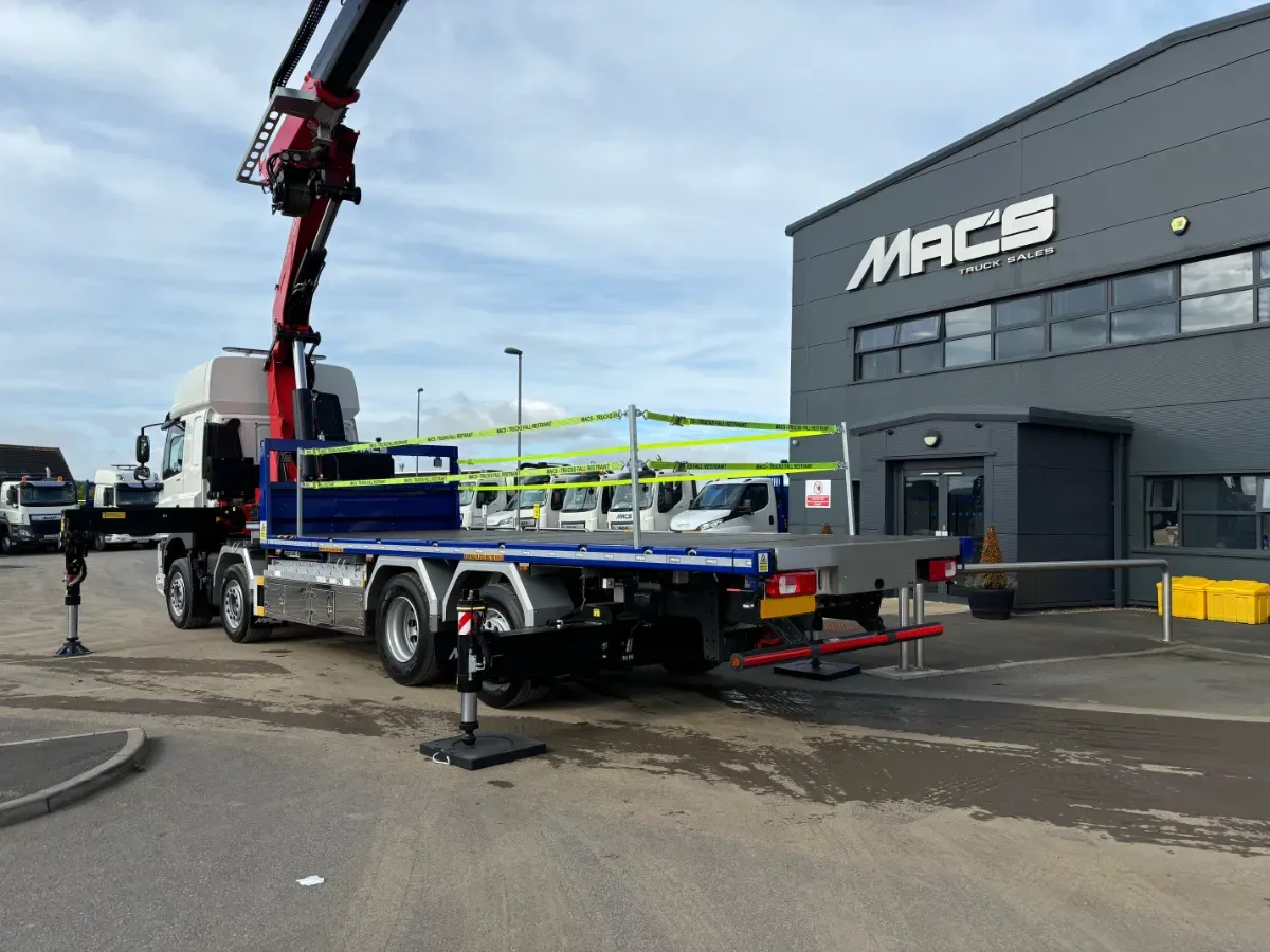 2025 DAF CF480 – Space cab sleeper – 32 ton GVW – 44 train weight – Auto – Air con – Fitted FASSI F710RA2.27 crane with L426 fly jib – V20 winch – Macs Front Leg System - heavy duty Macs flat body with hydraulic pull out bar – Choice available.