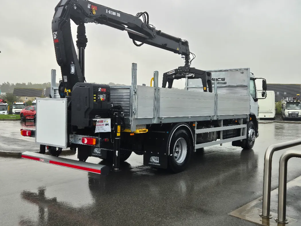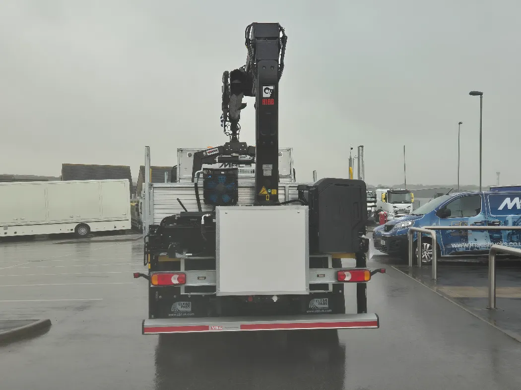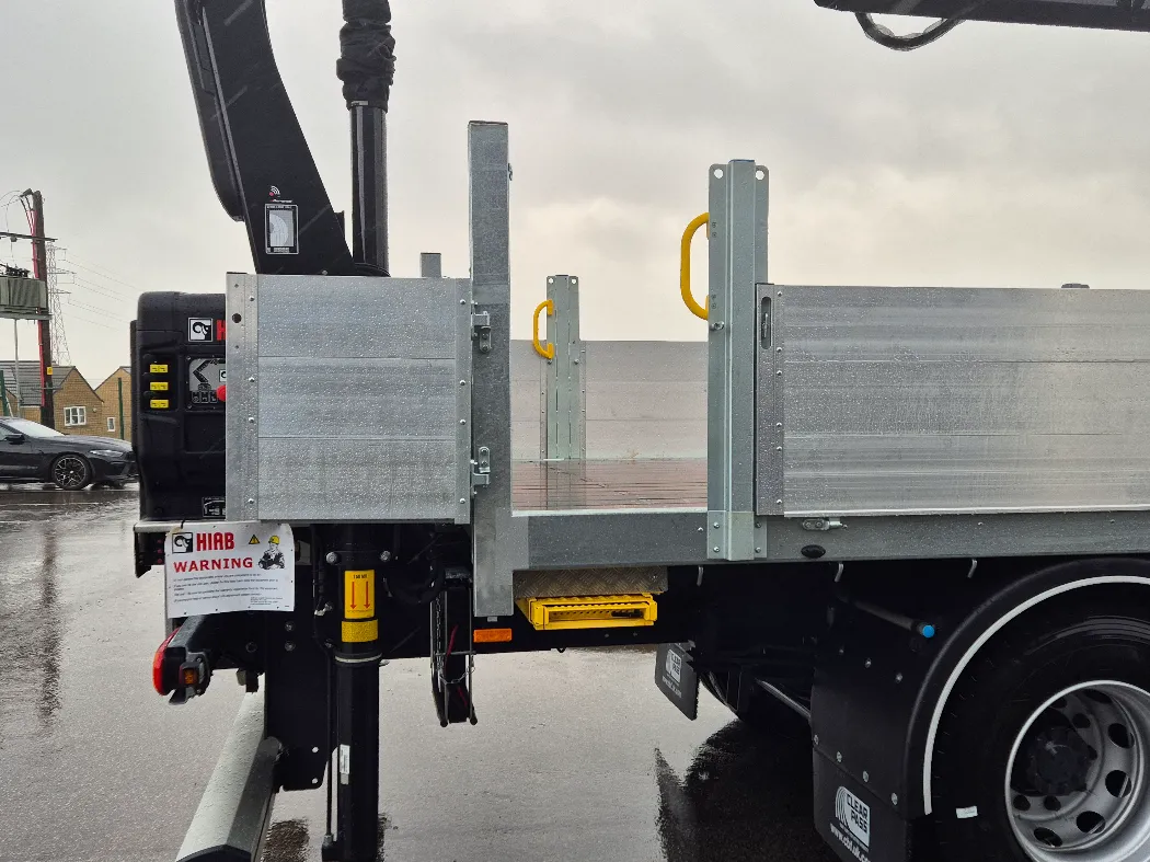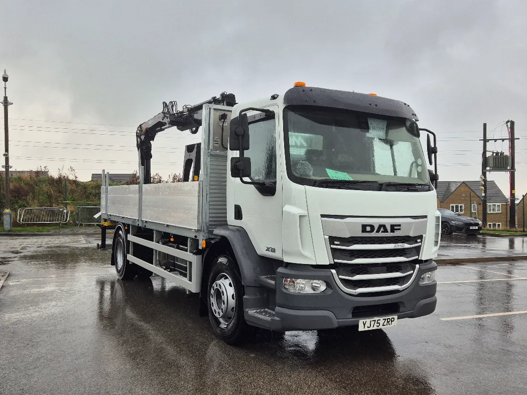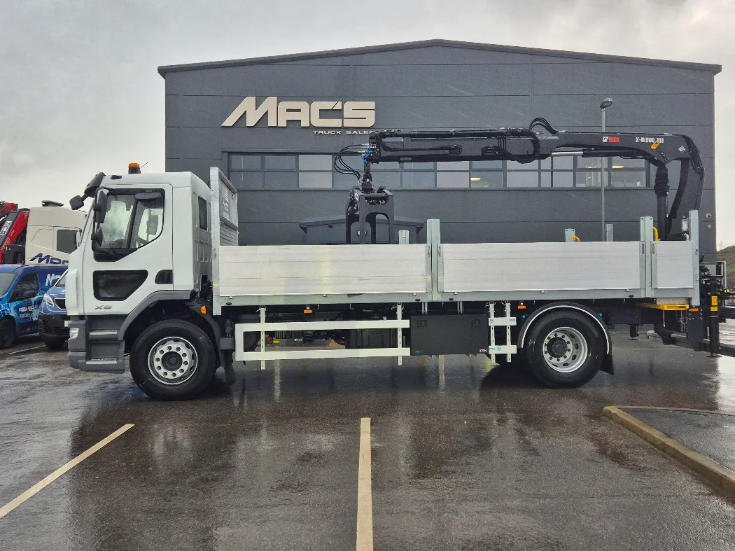 DAF XB 260 – 18T GVW – Day cab – 4x2 – Auto gearbox – Air con – Sun visor – Bluetooth – Hiab 118 crane – 2 hydraulic extensions – Remote control – Kinshoffer hydraulic brick grab – Builders merchant body – Aluminium drop sides – Body access ladder – V groove side raves with lashing rings.