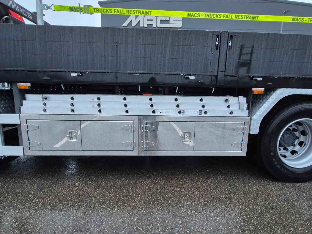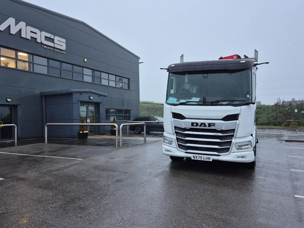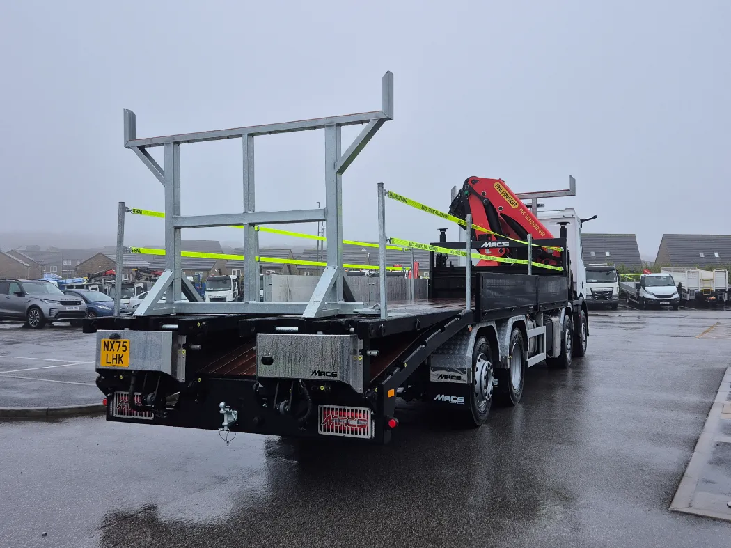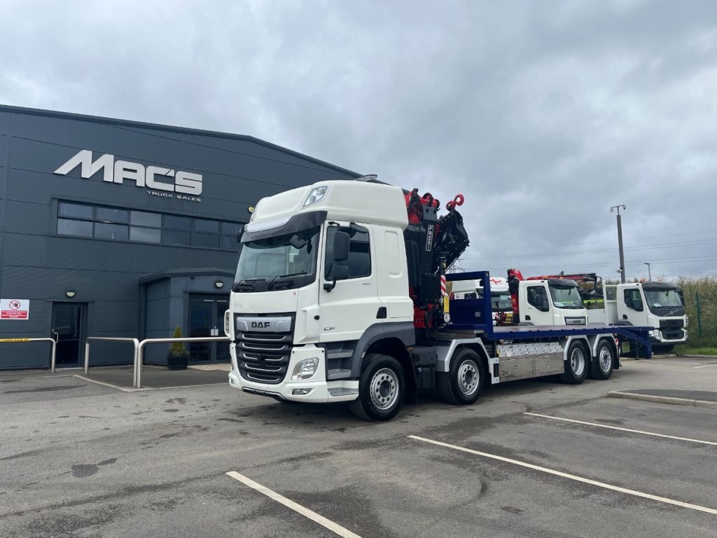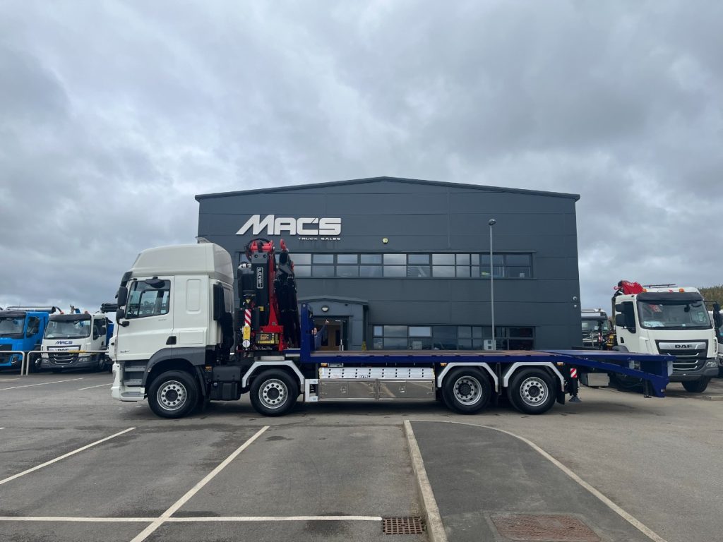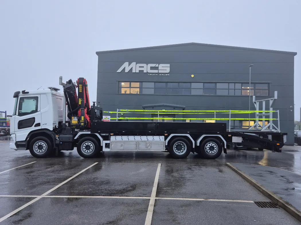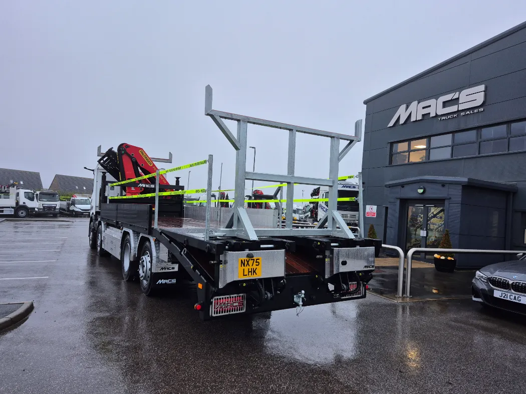 New DAF XD 450 – 8x2 – Rear steer – Auto gearbox – 3* DVS rated cab – Palfinger or Fassi crane options – Remote controls – Mac’s cheesewedge body – Hydraulic ramps – Bolster frames to front and rear with back on locked down via twist locks – front drop sides – lashing rings in the side rails – Stainless toolboxes – 3 stage ladder stowage – Chassis in stock ready to build to your spec