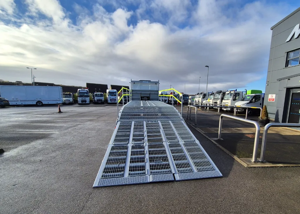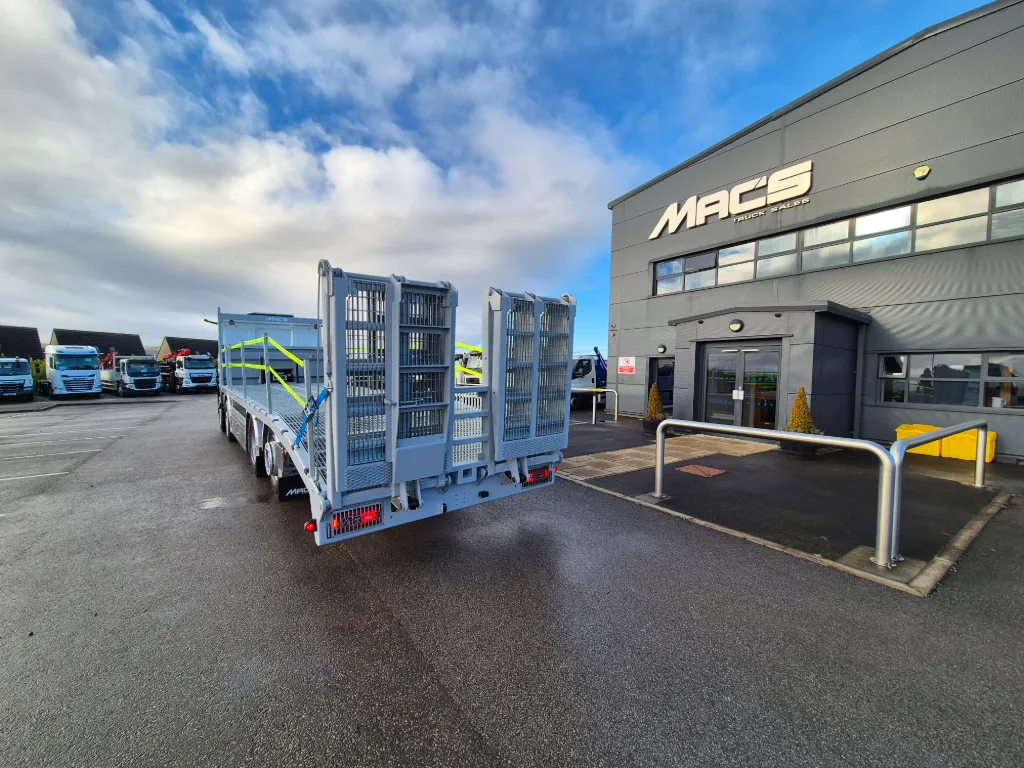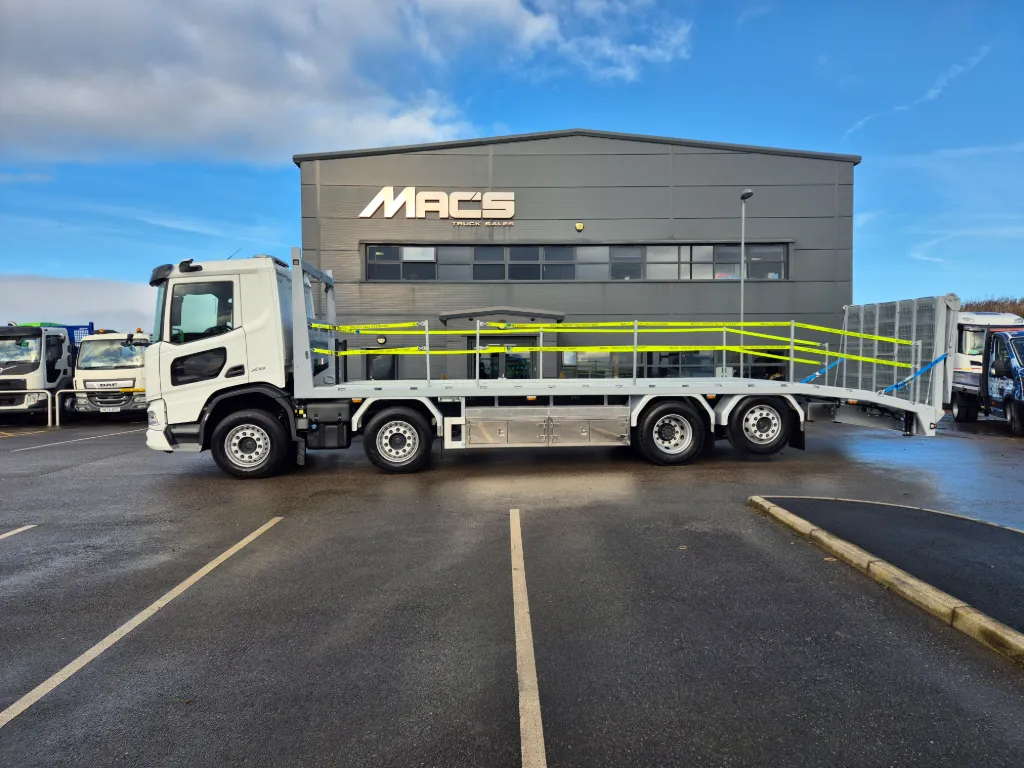 New shape DAF XD 450 – Day cab – 3* Rated DVS cab with vison window in the passenger door – Mirror cam system – Auto gearbox – Rear air suspension – Rear lift and steer – Mac’s Full access spec beavertail body – Flow Forge mesh flooring full length of the body – Full width ramps with gate in the middle – Lashing points down the centre of the body – Side raves with lashing rings inset and castellated underneath for lashing to – Fall restraints – Stainless toolboxes with trays – Aluminium mud wings – Cab high headboard – Winch protection guard – To come with working lights and strobes – IN STOCK READY TO GO.