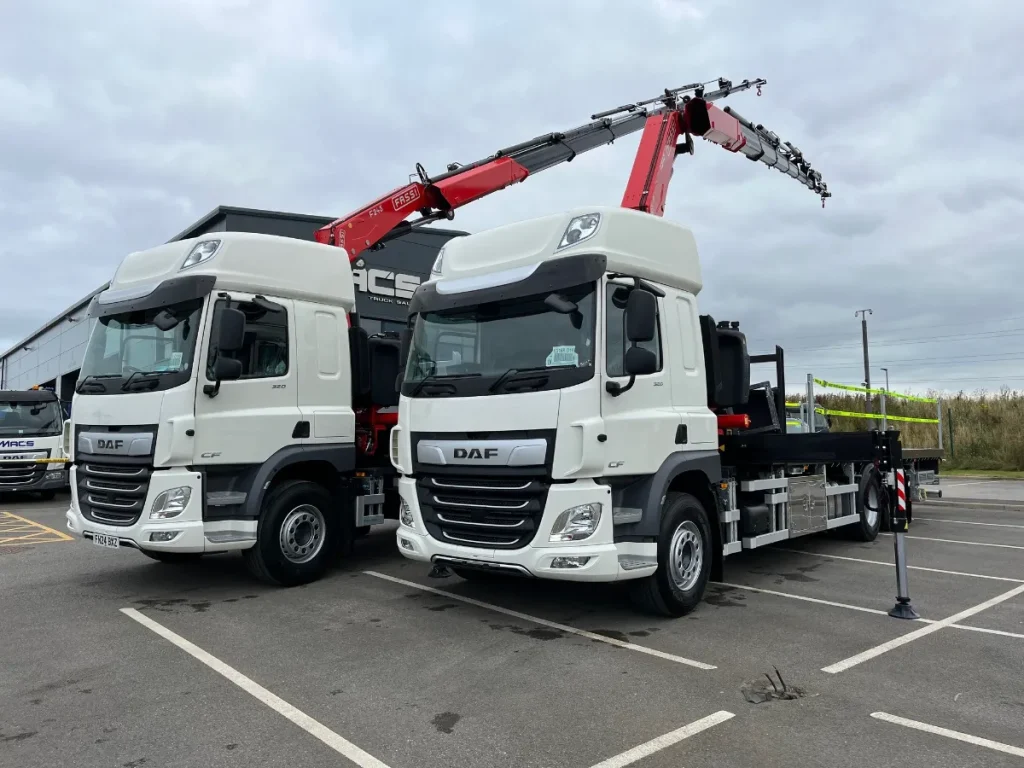 Fassi F55 – 3 hydraulic extensions – Remote control – Hydraulic legs – Auto gearbox – Triple seats – Air con – Flatbed body – Aluminium drop sides – Lashing rings inset to the floor.
