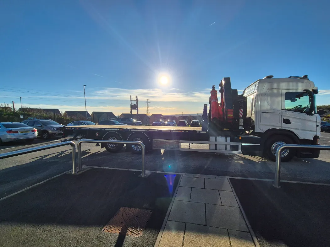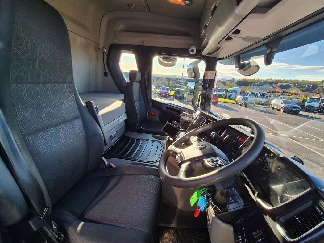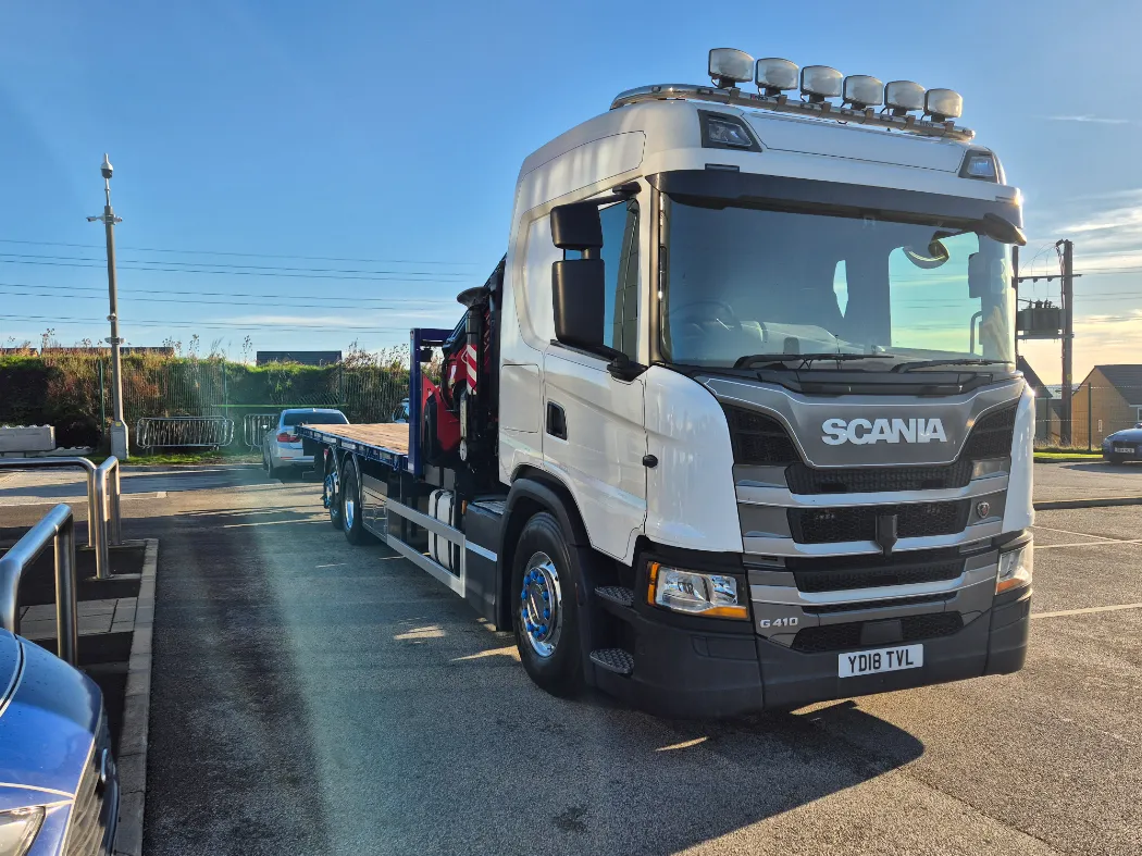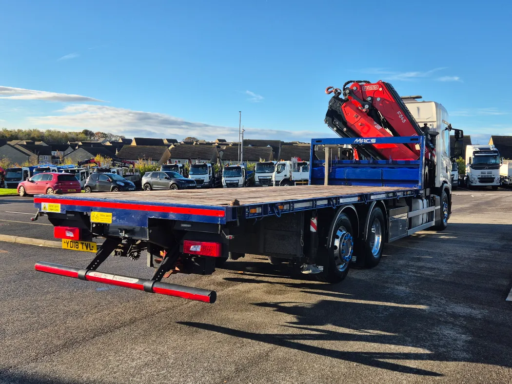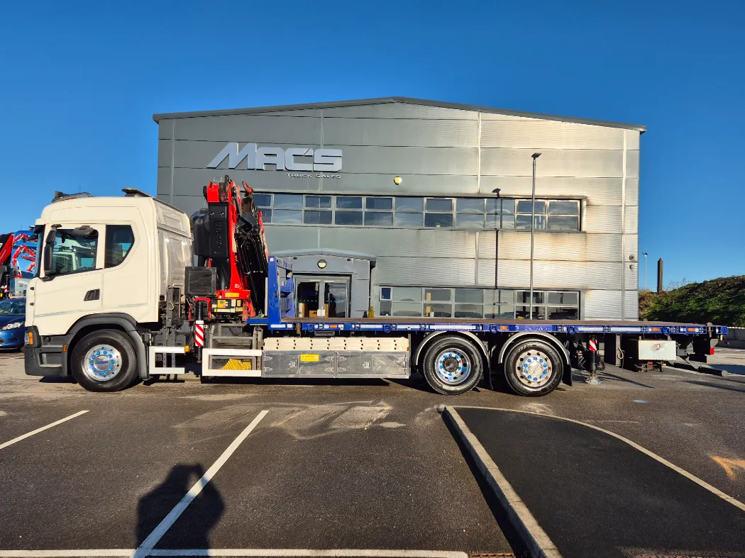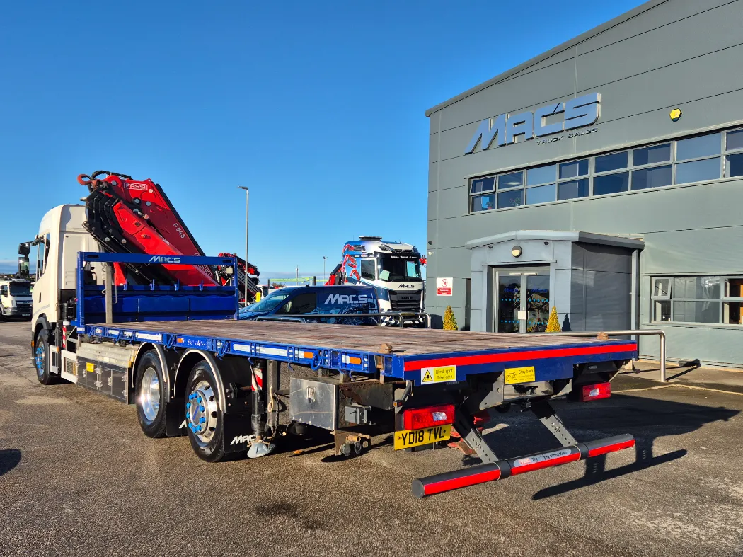 2018 Scania G410 – hi line sleeper – Auto – Fitted FASSI F545RA2.25 crane – Remote control – Macs cabin specification flat body with twist locks and drawbar coupling – Immaculate condition.