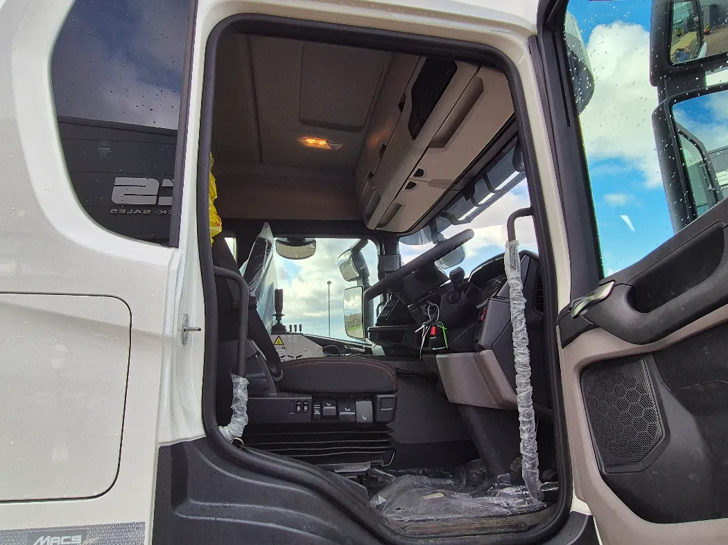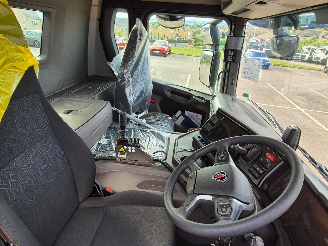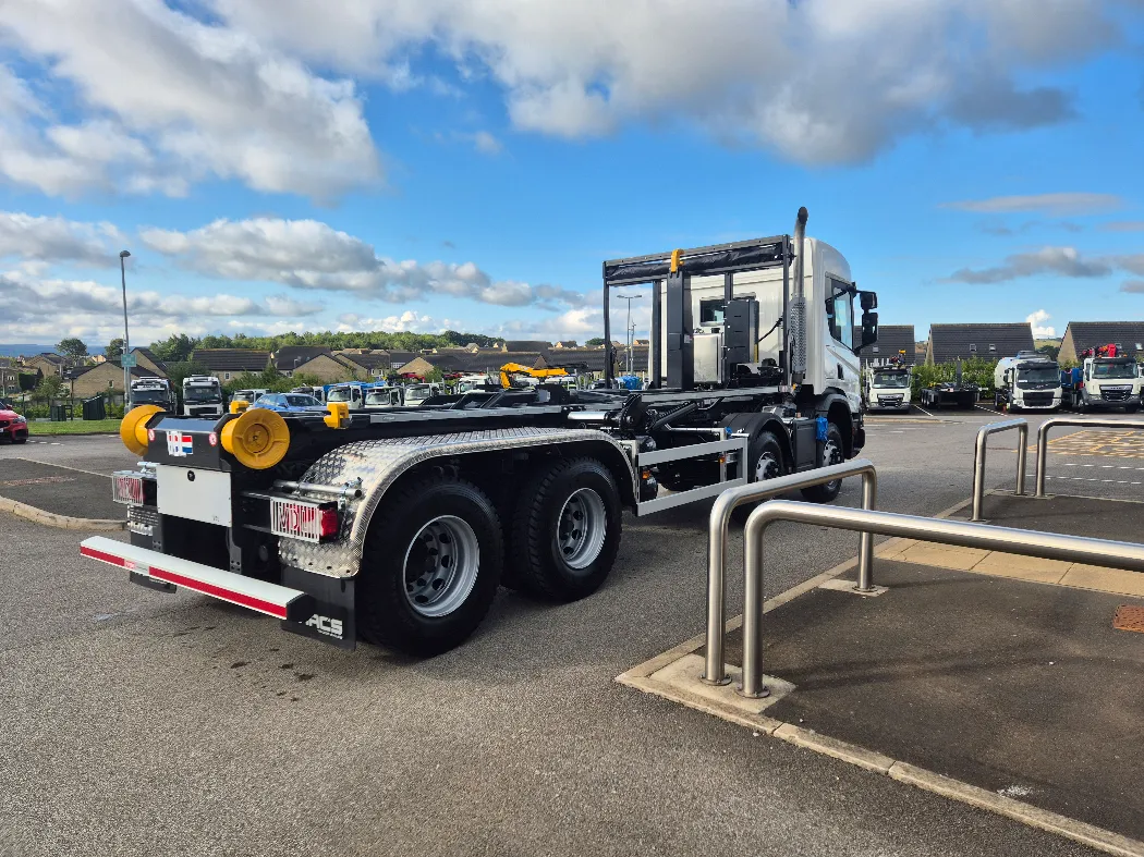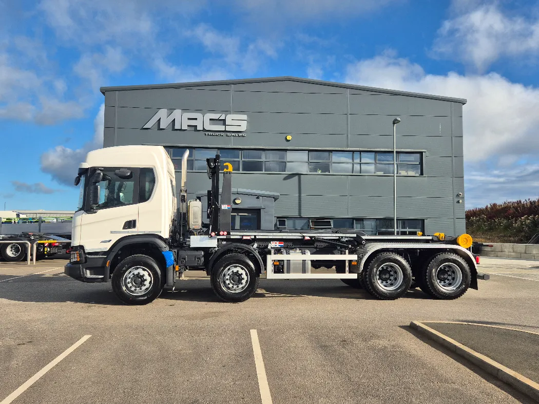 Scania P420 XT – 8x4 – Double drive – 2 Pedal opti cruise auto gearbox – XT construction spec chassis – 2 years R&M – VDL 25T Hook equipment – Aluminium chequer mud wings – Transcover hydraulic sheeting system – Sheeting system hydraulically extends width ways – In cab hook controls with out side the cab manual over ride control – Rear lights fully protected with light guards – IN STOCK READY TO GO.