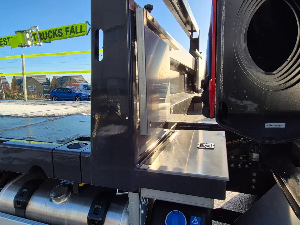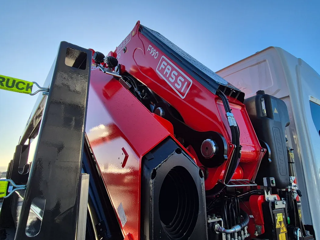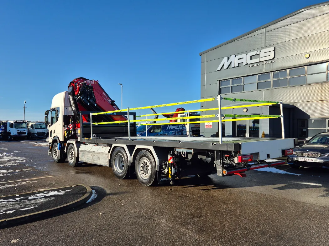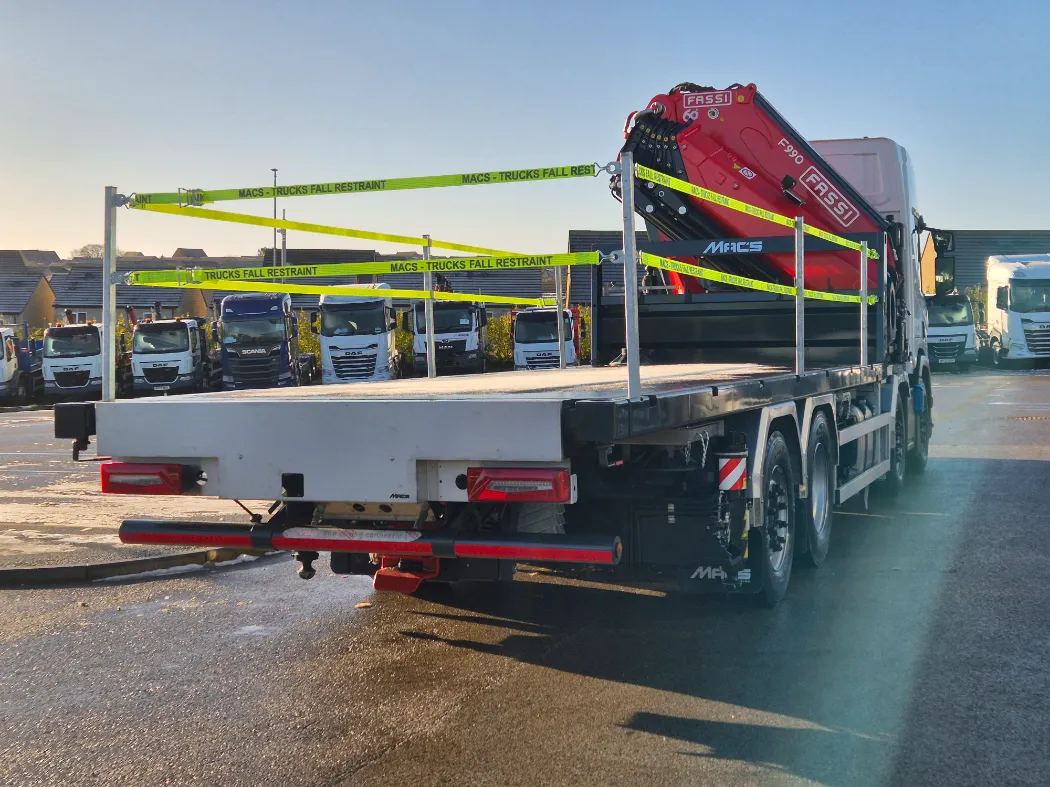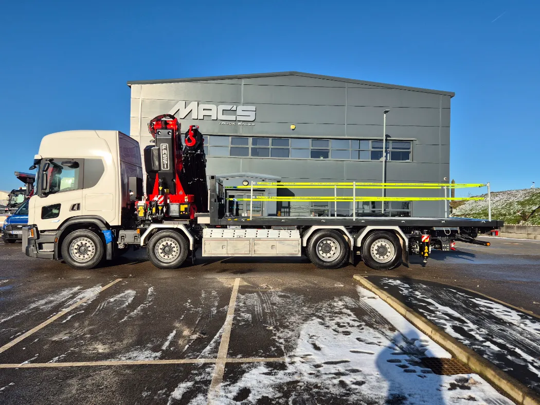 Scania P500 – 8x2 – High roof sleeper – Rear steering axle – Top spec inside the cab with fridge and sat navigation – Fassi F990RA.2.26 – 6 Hydraulic extensions – Mac’s front legs system – NEARLY 7T Payload – Mac’s cabin spec body – Hydraulic back end with twist locks – Stainless toolboxes, Chain wells, spreader pad holders – Galvanised side raves and headboard – IN STOCK NOW!