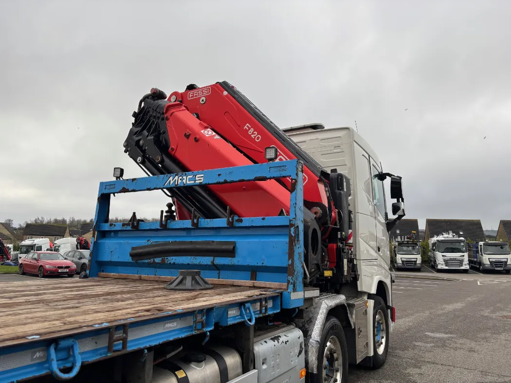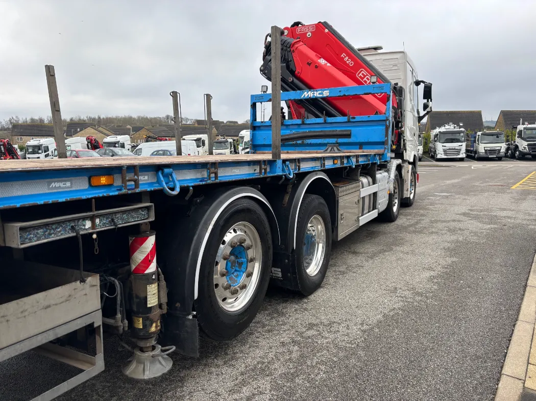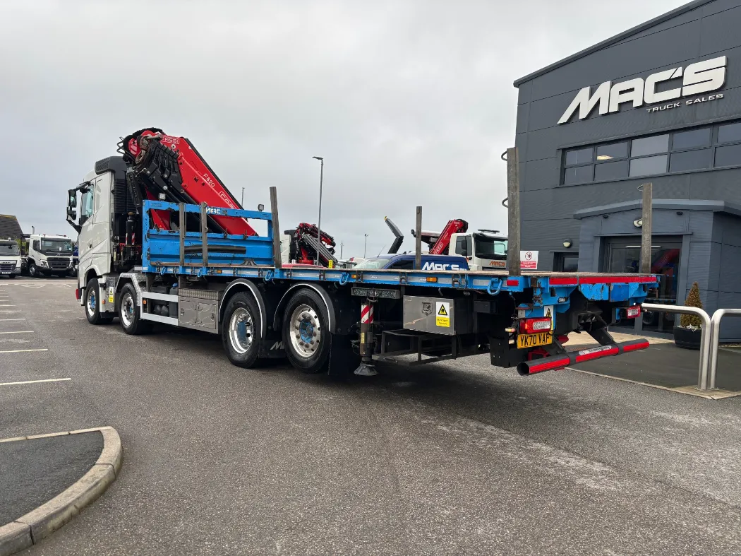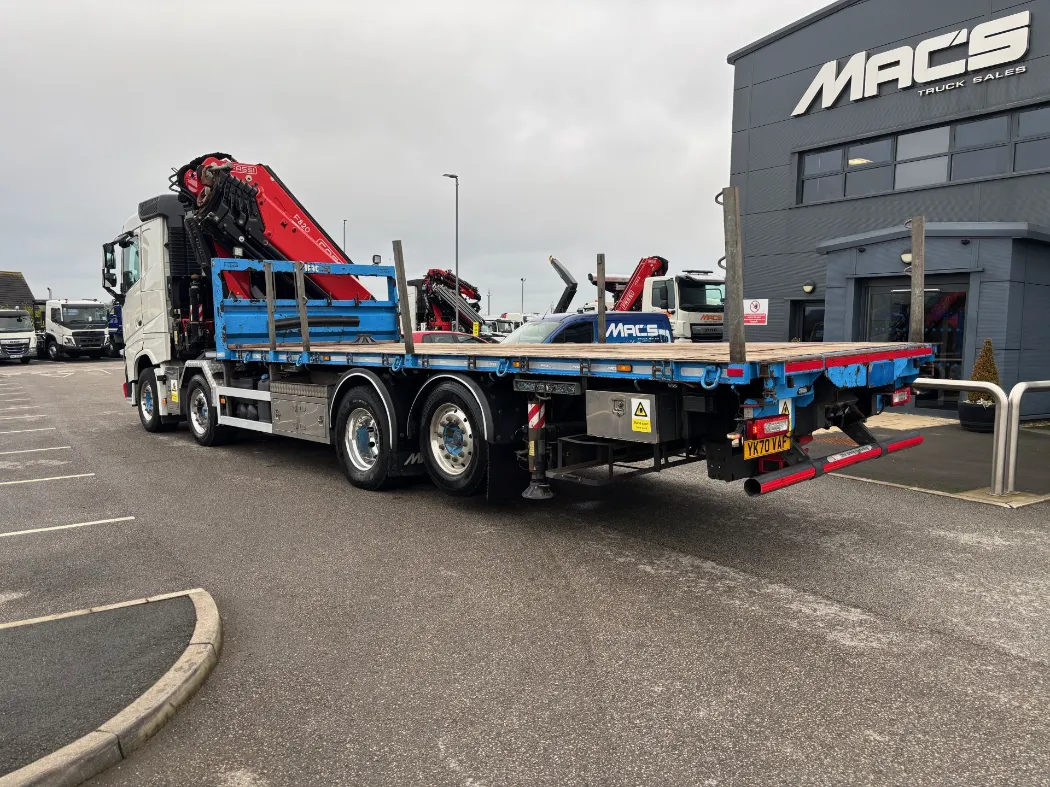2021 – Volvo FH 460 – 8x2 – FH sleeper cab – 32 ton GVW – 44 ton train weight drawbar specification – 9t front axles – Rear lift and steer back axle – Fridge – Alloys – Fitted FASSI F820RA2.26 crane – Macs cabin specification flat body with twist locks – Hydraulic pull out bar.