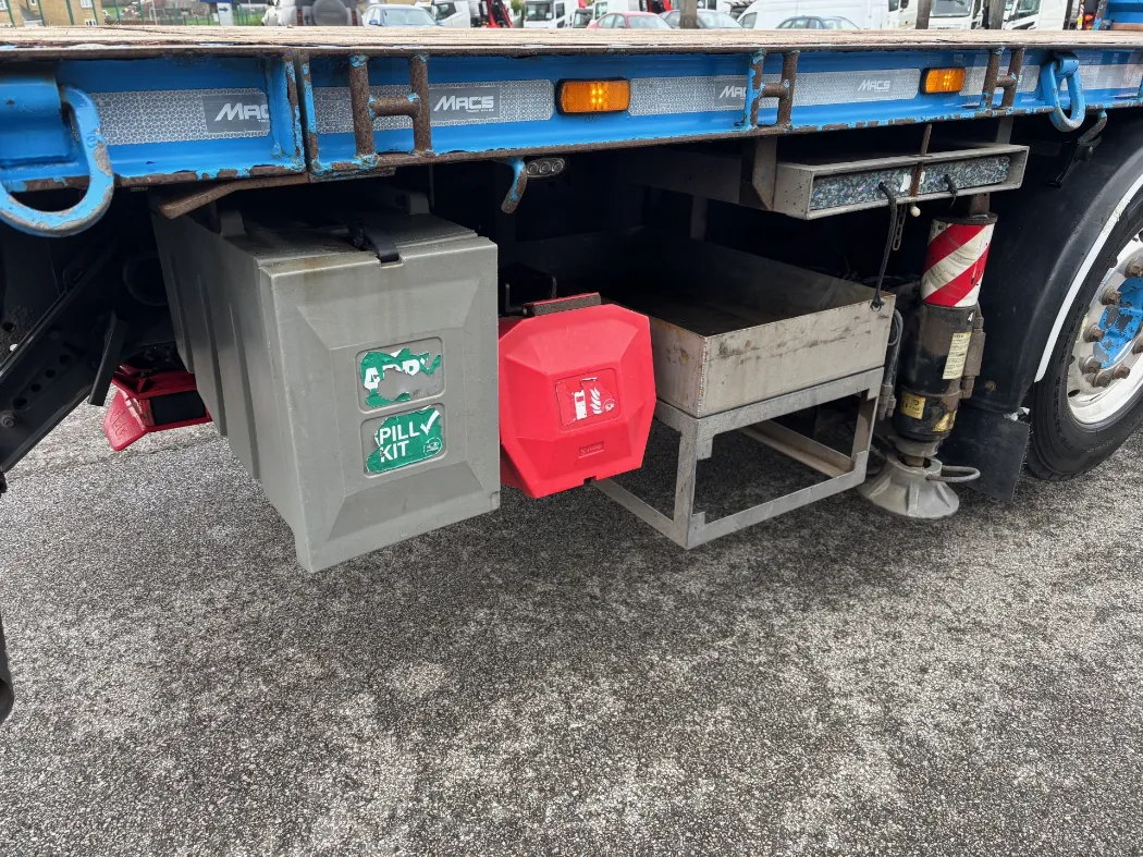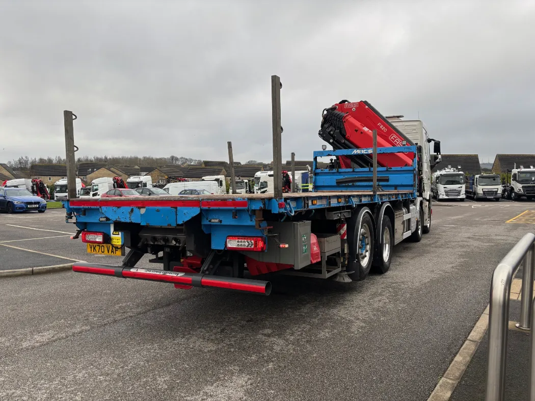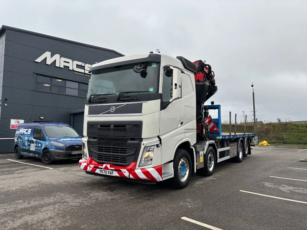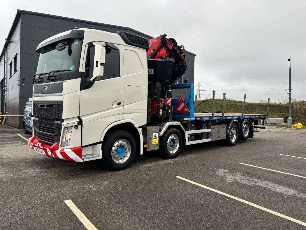 2021 – Volvo FH 460 – 8x2 – FH sleeper cab – 32 ton GVW – 44 ton train weight drawbar specification – 9t front axles – Rear lift and steer back axle – Fridge – Alloys – Fitted FASSI F820RA2.26 crane – Macs cabin specification flat body with twist locks – Hydraulic pull out bar.