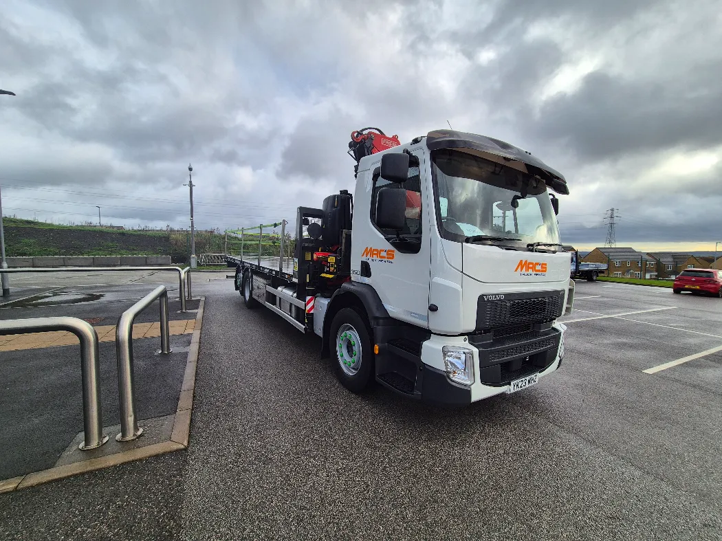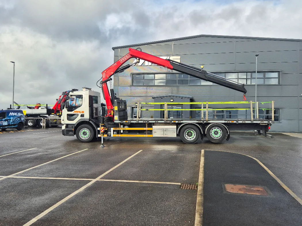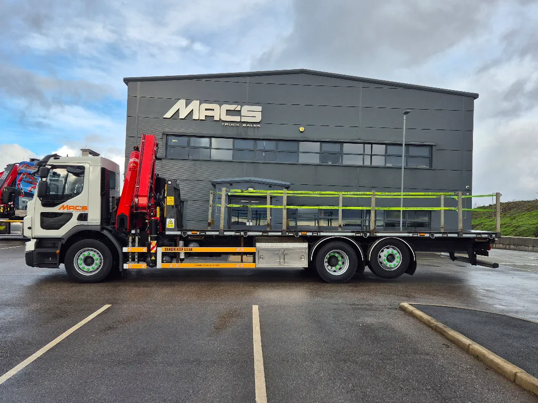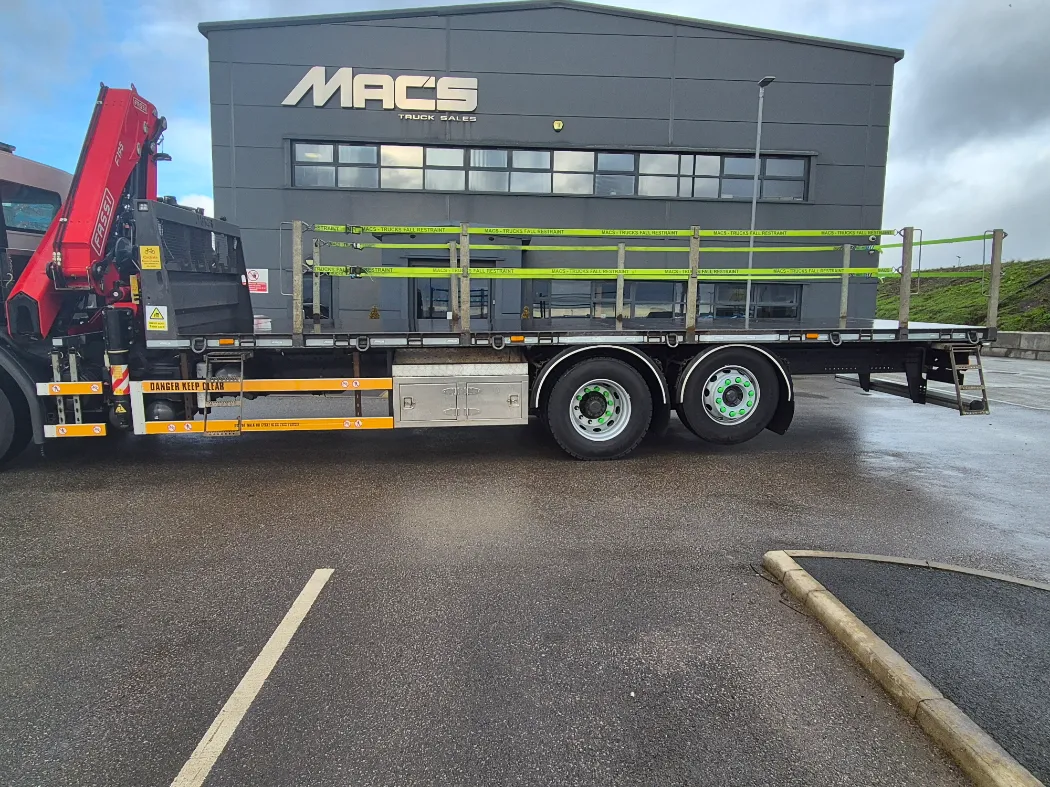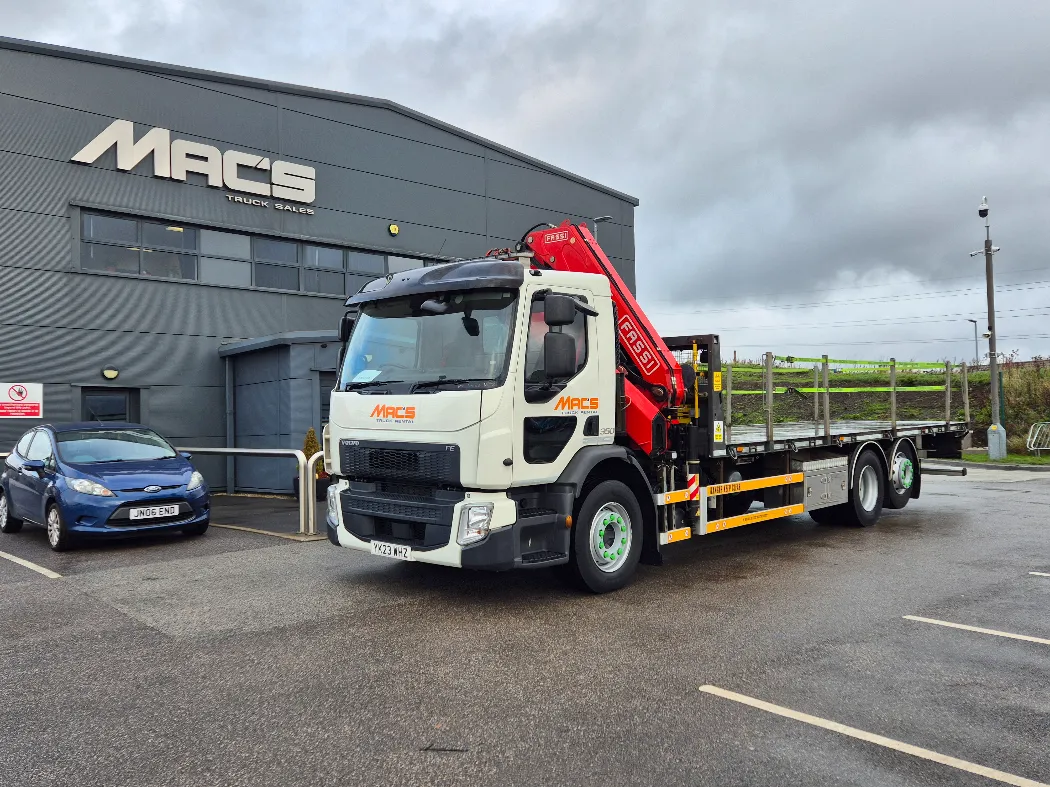2023 Volvo FE 350 – Day cab – 6x2 rear lift and steer – 9t front axle – 26 ton GVW – Fitted FASSI F195A2.22 crane with remote control – Heavy duty flat body – Lashing rings – Fall restrainT posts and pockets – LED beacon bar and strobes.