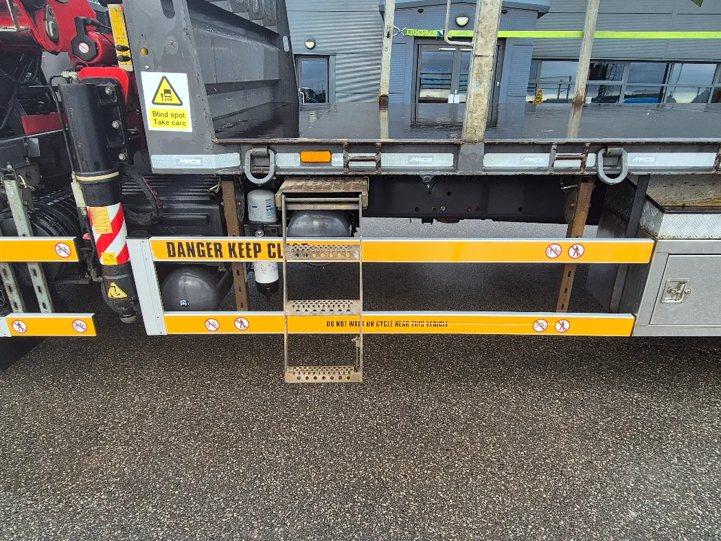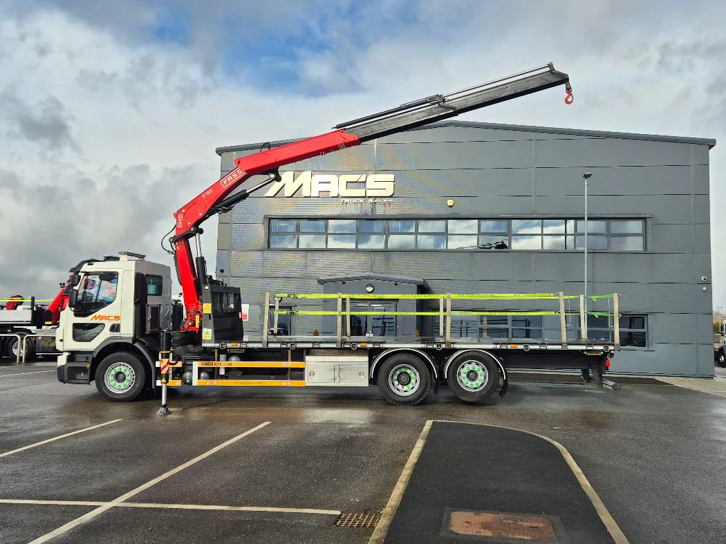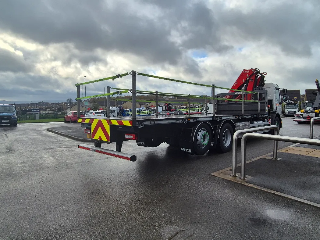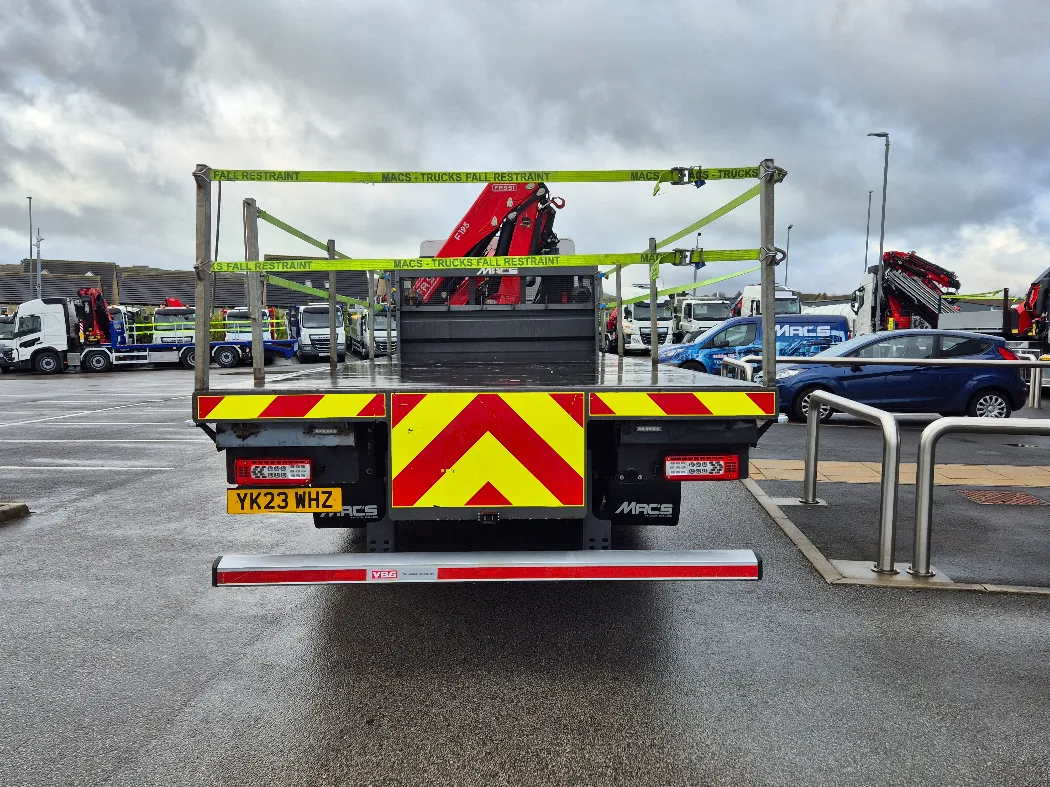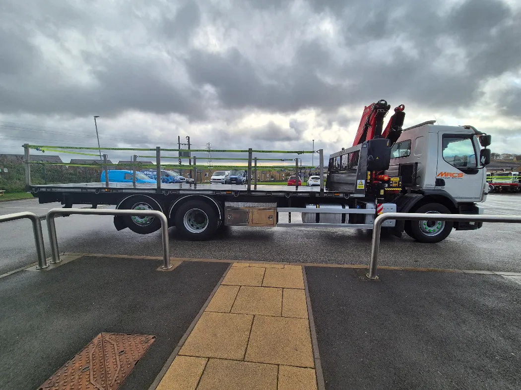 2023 Volvo FE 350 – Day cab – 6x2 rear lift and steer – 9t front axle – 26 ton GVW – Fitted FASSI F195A2.22 crane with remote control – Heavy duty flat body – Lashing rings – Fall restrainT posts and pockets – LED beacon bar and strobes.