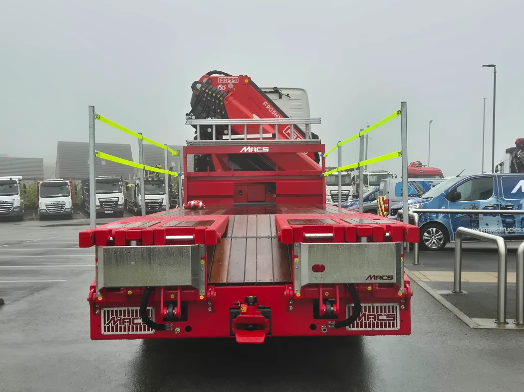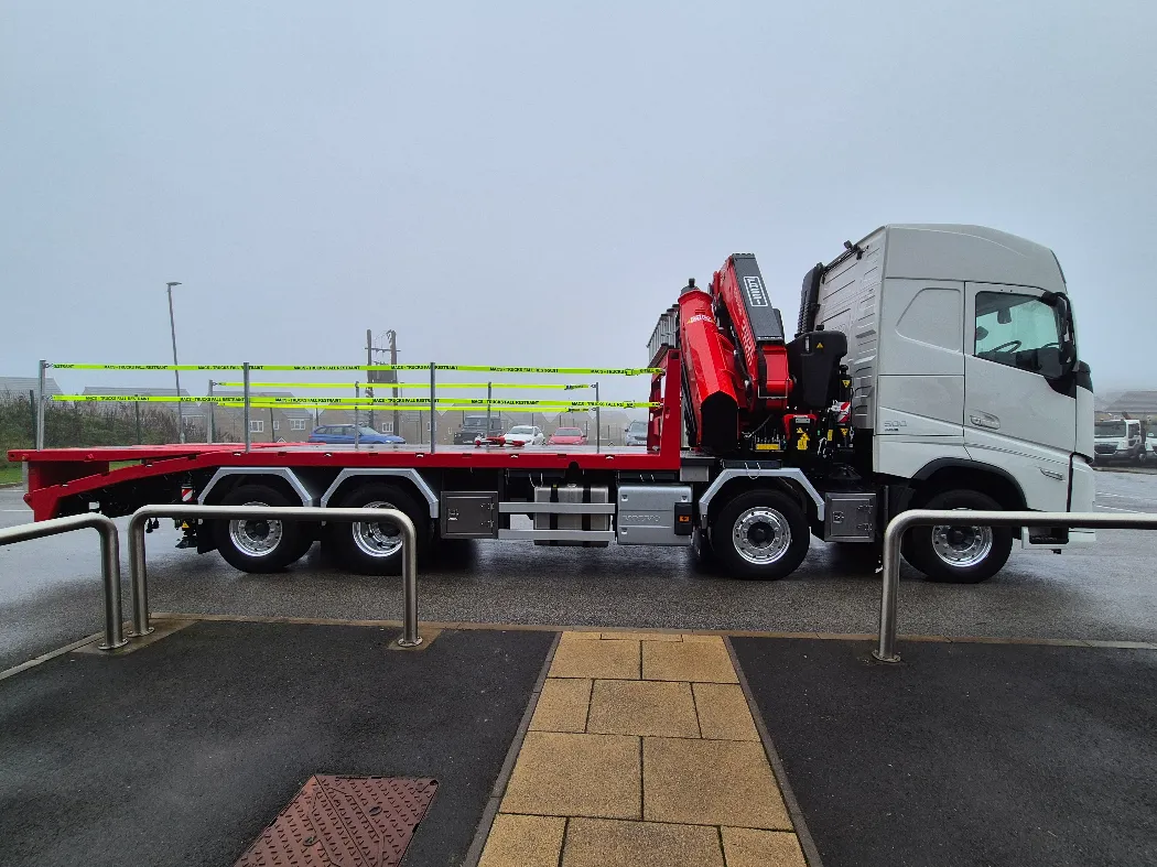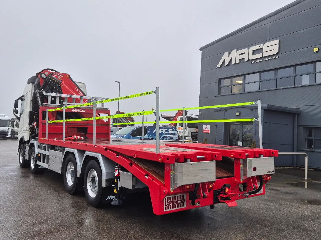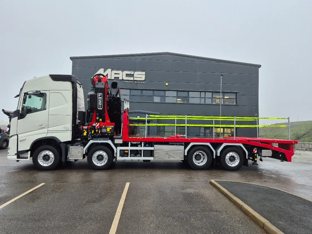 Volvo FH 500 – AERO globetrotter sleeper cab – 8x2 – Rear steer – I-Shift auto gearbox – Fassi F905RA.2.26 – FRONT LEGS BEHIND THE GRILL – Fully remote controlled – Mac’s Cheesewedge body – Hydraulic bi folding ramps – Fall restraints – Lashing points inset to the side raves – Ally mud wings – Stainless toolbox storage – CHOICE IN BUILD NOW.