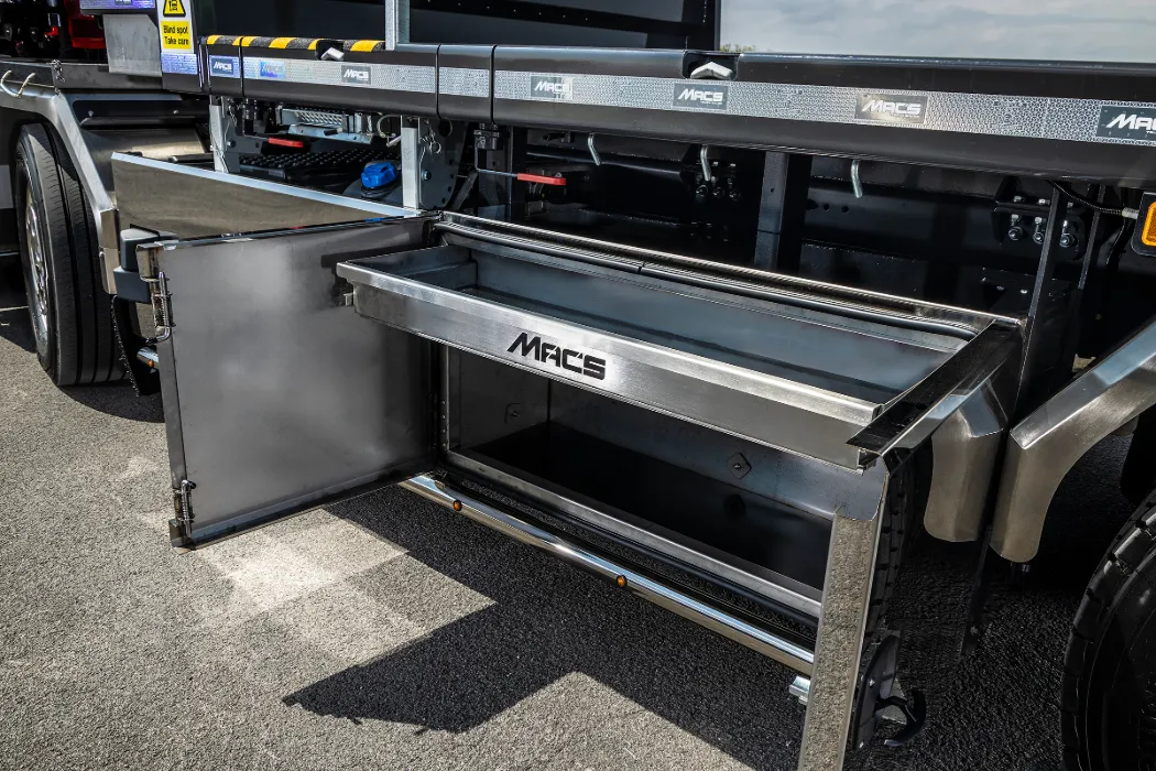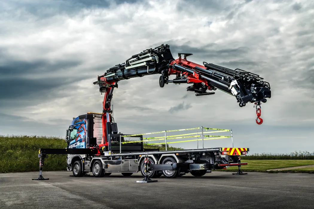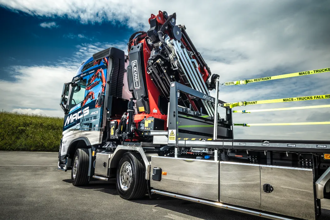 New generation Fassi F905RA.2.27 with L426 fly jib – V20 winch with load cell – V7 remote control with fully digital screen – Four operational speeds – New improved stability system – Quick release valve block between crane and fly – FH 500 Globetrotter cab – Rear lift and steer – I-Shift auto gearbox – Mac’s flatbed bodywork – Lashing rings inset to the side rails – Stainless toolboxes with trays inside - Hydraulic greedy bar – Fall restraints – Galvanised side raves and headboard – VBG drawbar hitch .