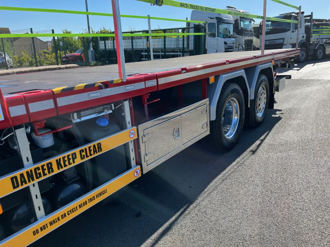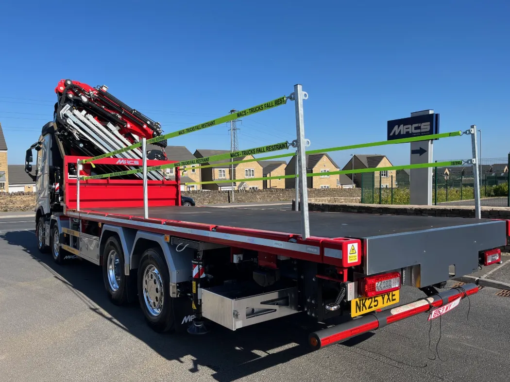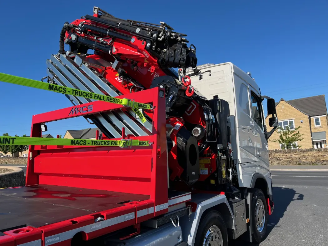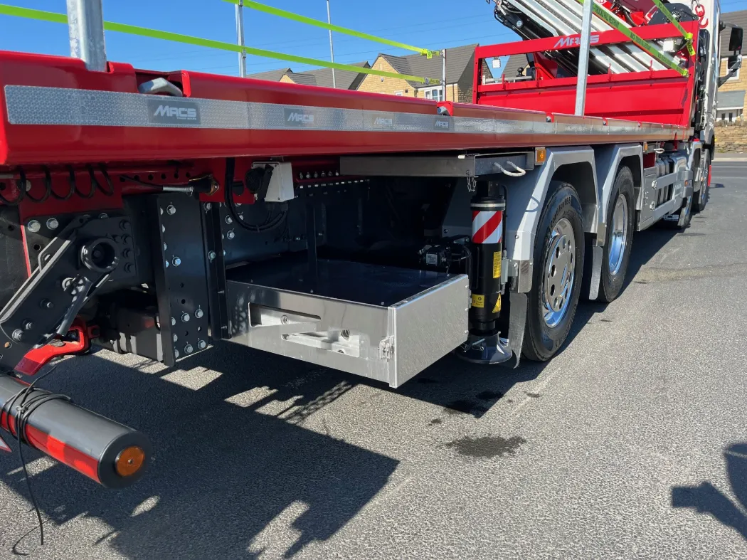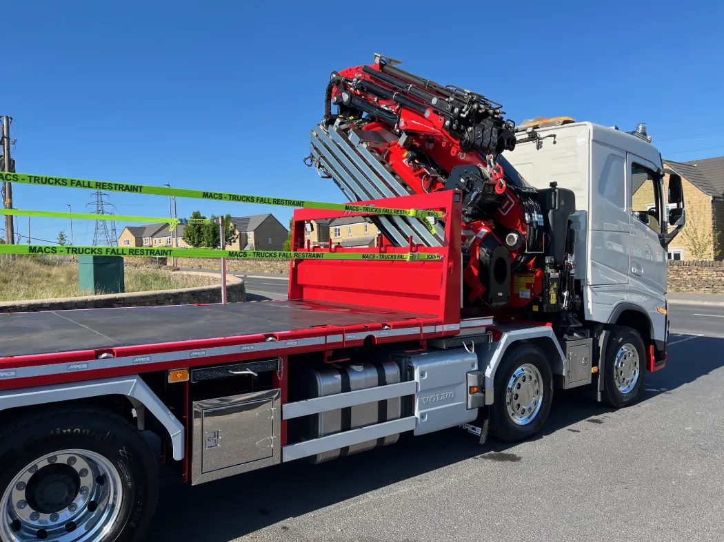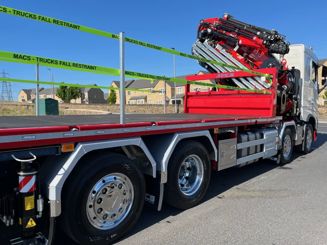 Volvo FH flat roof sleeper cab – 8x2 – Rear lift and steer – 9T Front axles – i-shift auto gearbox – Fassi F710RA.2.27 with L426 fly jib – 7 extensions in the crane and 6 in the fly jib – Full remote control – Mac’s Patented front legs system – V20 double fall winch/ hoist – Mac’s cabin spec body – Stainless mud wings – Stainless toolboxes – Galvanized side raves and headboard – Stainless chain wells with lids – Drawbar spec – Fall restraint straps and posts | FURTHER VEHICLES IN BUILD NOW