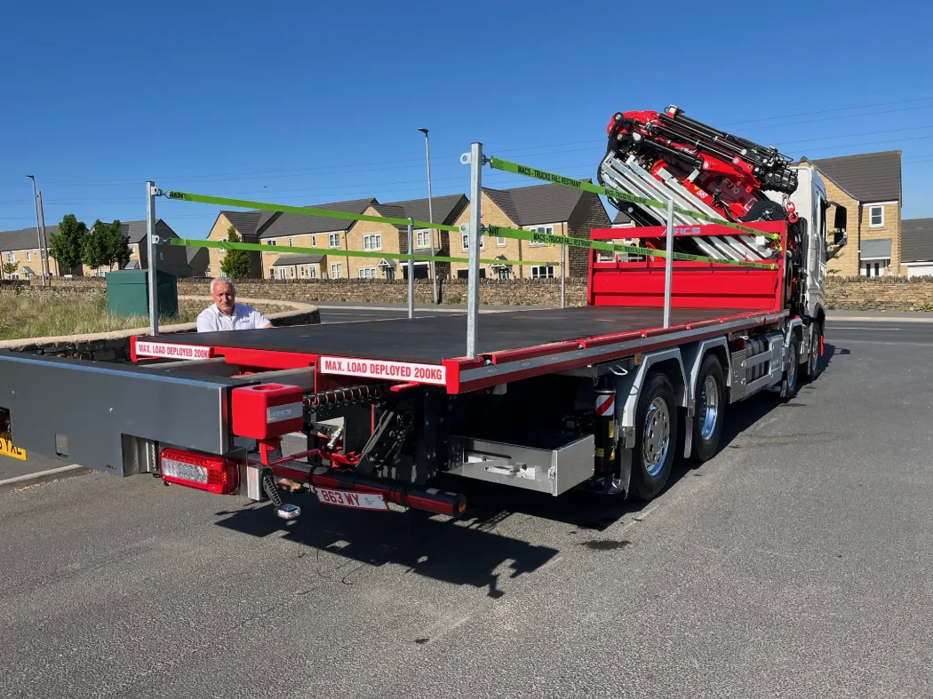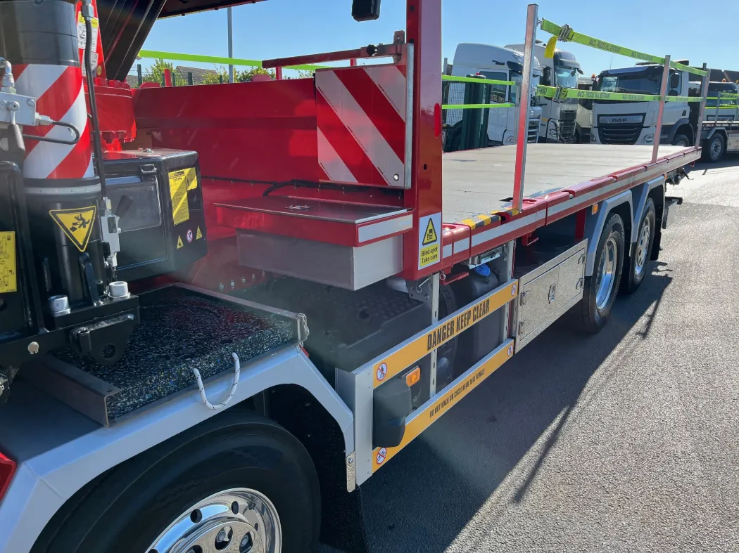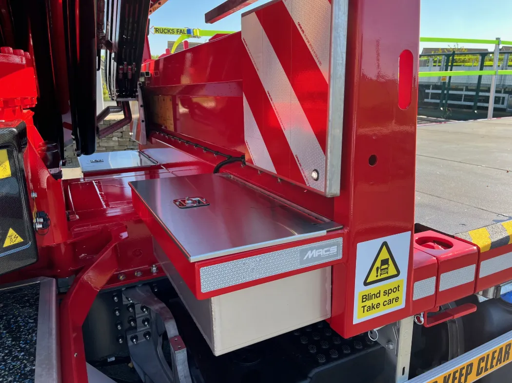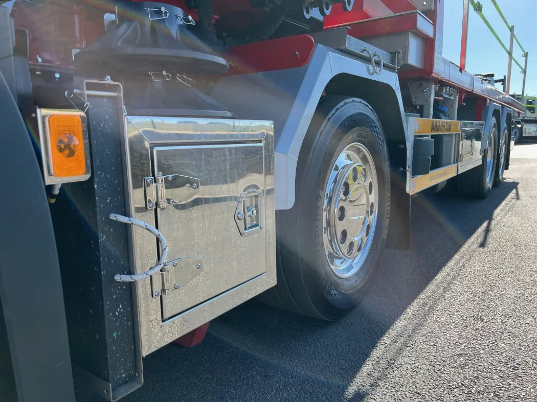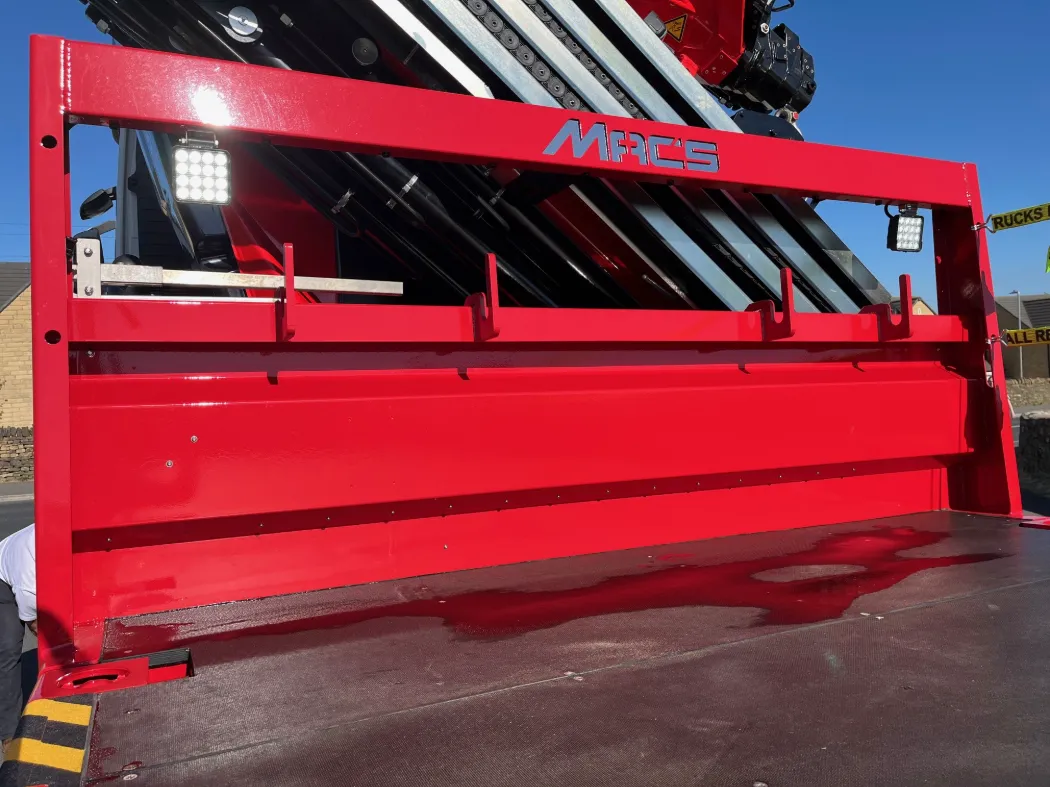 Volvo FH flat roof sleeper cab – 8x2 – Rear lift and steer – 9T Front axles – i-shift auto gearbox – Fassi F710RA.2.27 with L426 fly jib – 7 extensions in the crane and 6 in the fly jib – Full remote control – Mac’s Patented front legs system – V20 double fall winch/ hoist – Mac’s cabin spec body – Stainless mud wings – Stainless toolboxes – Galvanized side raves and headboard – Stainless chain wells with lids – Drawbar spec – Fall restraint straps and posts | FURTHER VEHICLES IN BUILD NOW