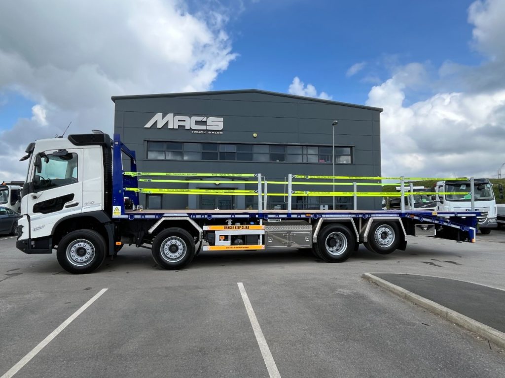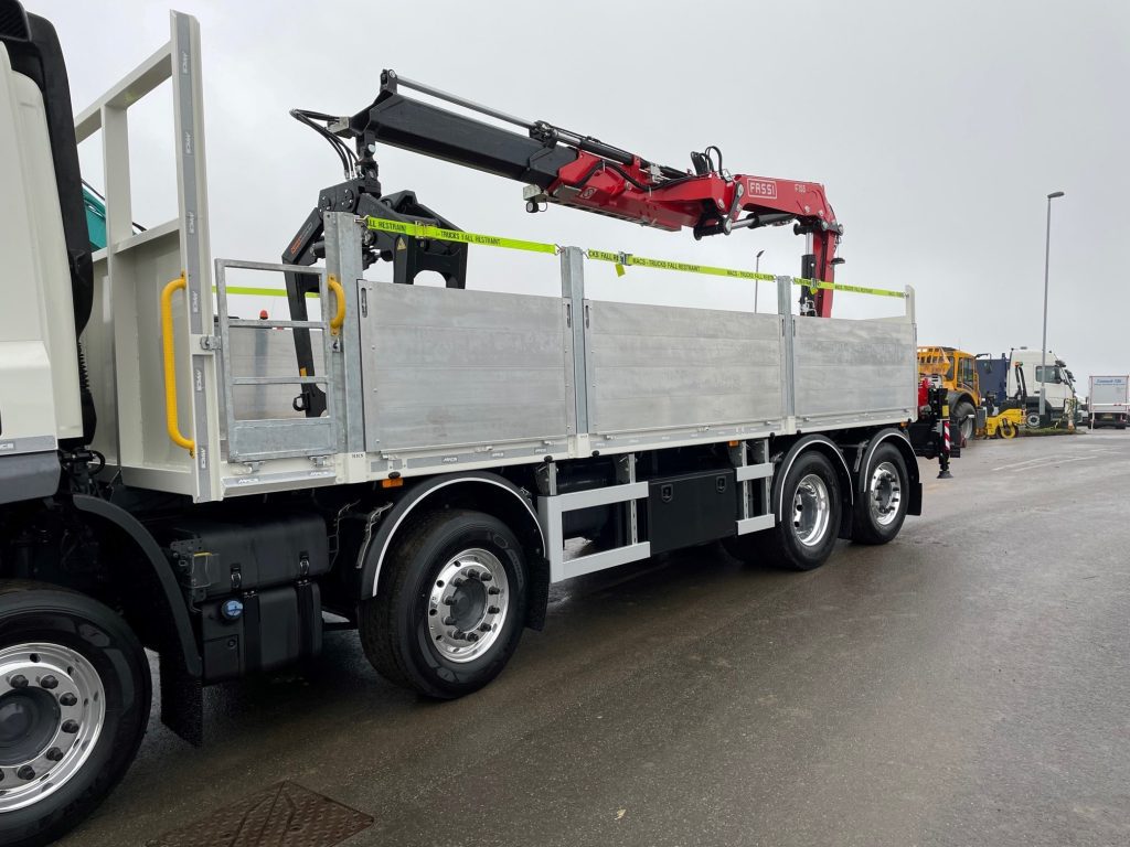 DAY CAB, I-SHIFT, AIR CON, ELECTRIC WINDOWS, REAR LIFT AND STEER, 9 TON FRONT AXLES, FITTED FASSI F400E.2.24 REMOTE CONTROL CRANE WITH 4x HYDRAULIC EXTENSIONS. NEW MACS CHEESEWEDGE BODY – AVAILABLE NOW.