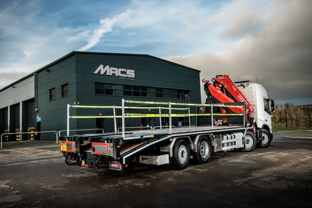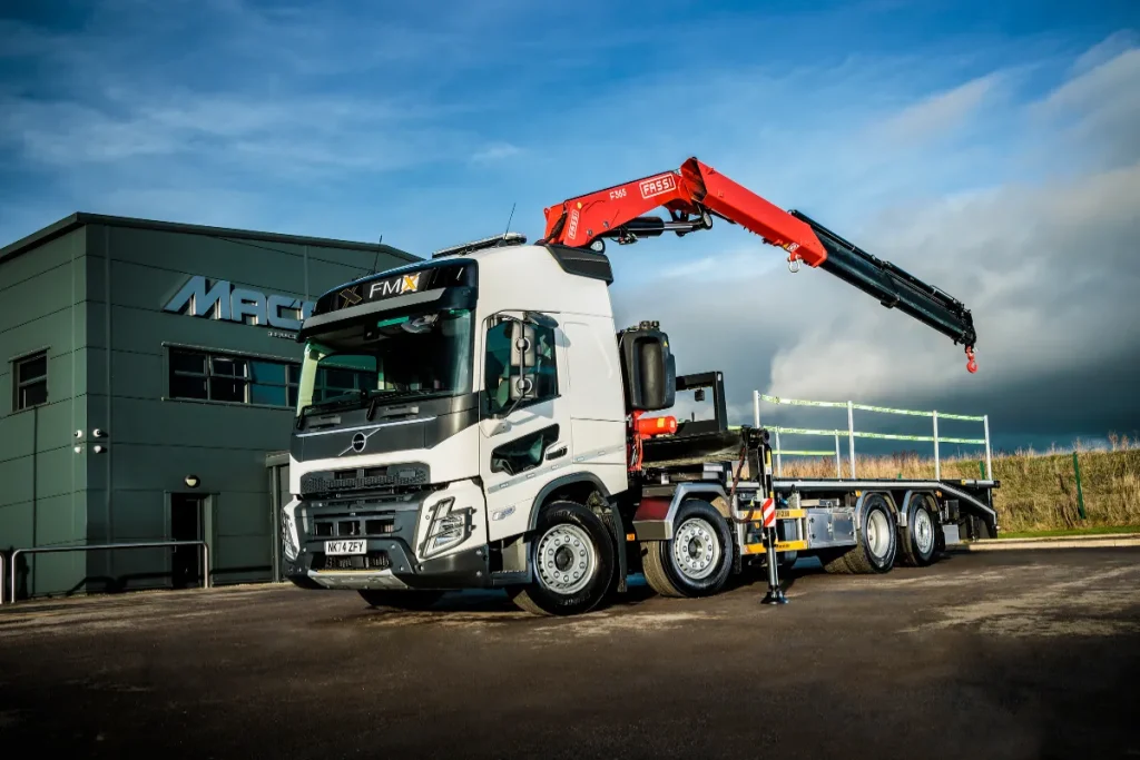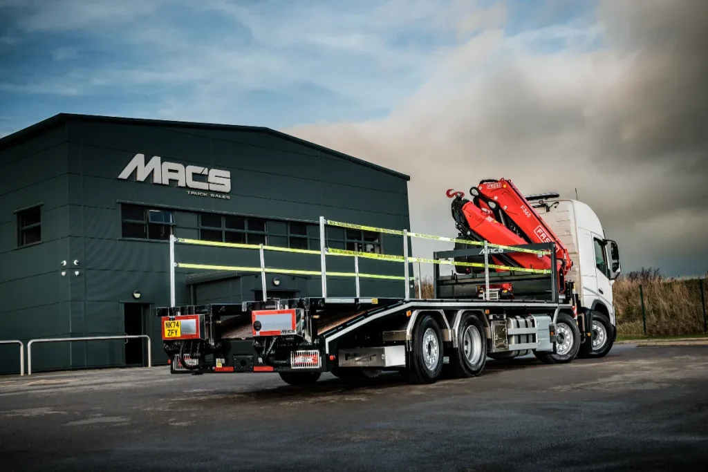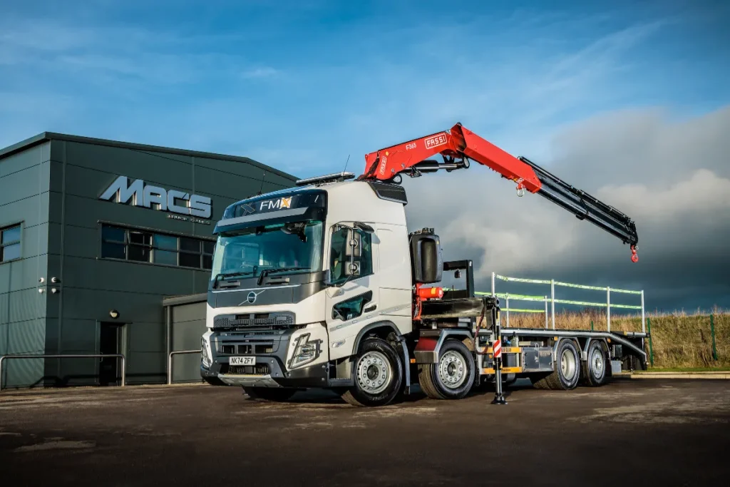 Volvo FMX 460 – 8x2 – Globetrotter sleeper cab – Rear steer and lift axle – I-Shift auto gearbox – 9T Front axles – Front and rear air suspension – 3* vison rated cab – Fassi F660RA.2.26 – 6 Hydraulic extensions – Remote control operation – Four speeds – Mac’s cabin spec body – Heavy duty side rails with lashing rings inset – Stainless toolboxes with trays – Aluminium mud wings – Twist locks – Hydraulic greedy bar – Drawbar hitch – ALWAYS IN BUILD CHOICE OF CABS AND BODIES.